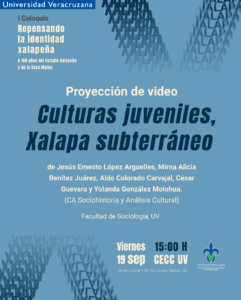 - Proyección de video Culturas juveniles, Xalapa Subterráneo de Jesús Ernesto López Arguelles, Mirna Alicia Benítez Juárez, Aldo Colorado Carvajal, César Guevara y Yolanda González Molohua (CA Sociohistoria y Análisis Cultural) Facultad de Sociología, UV