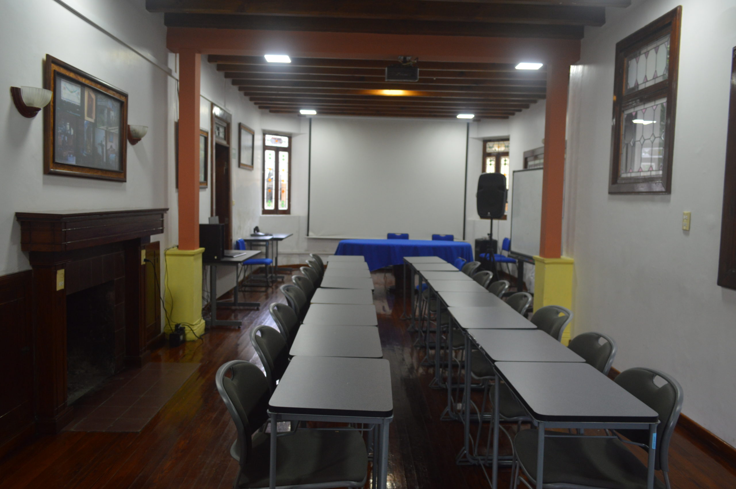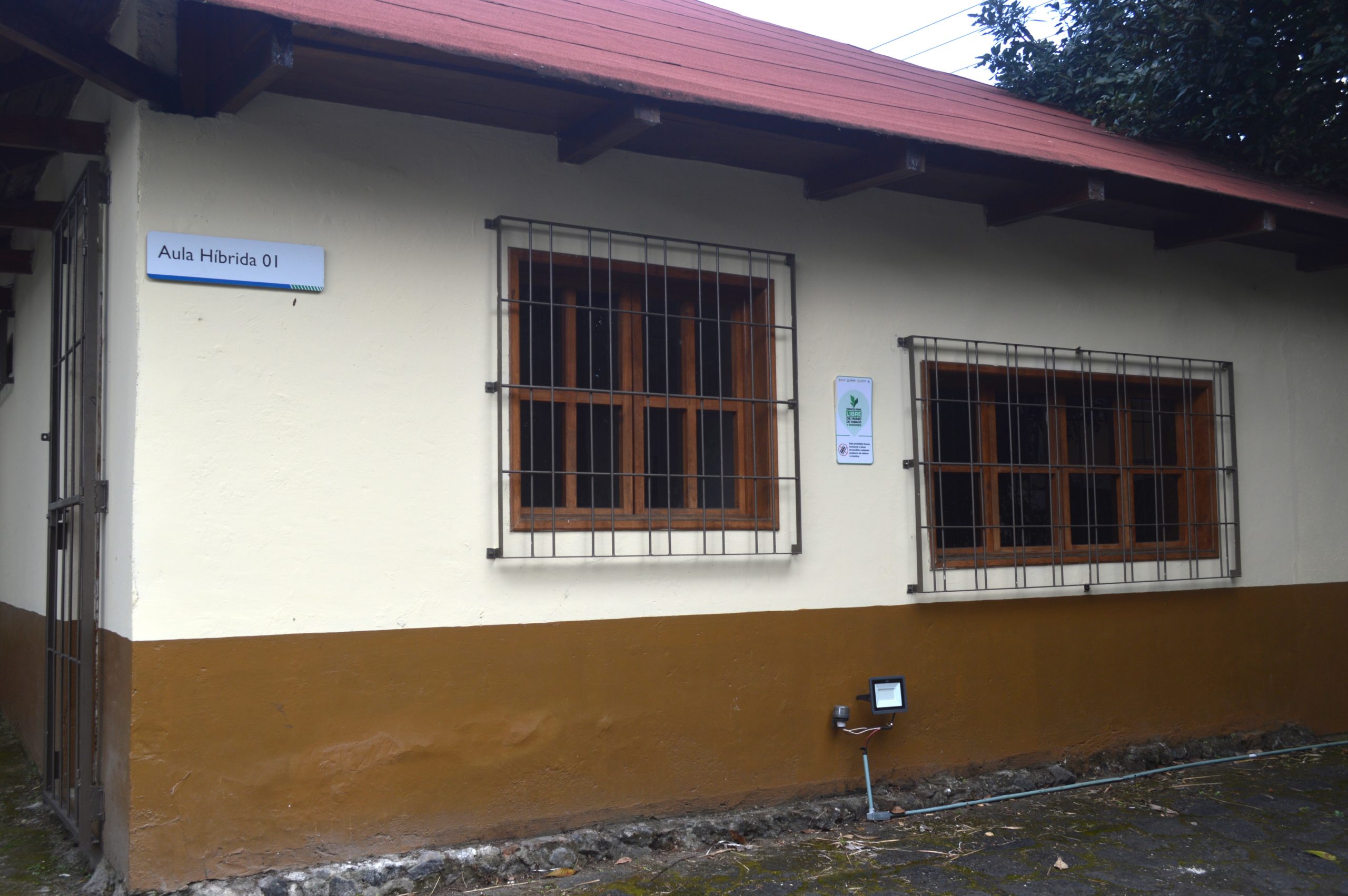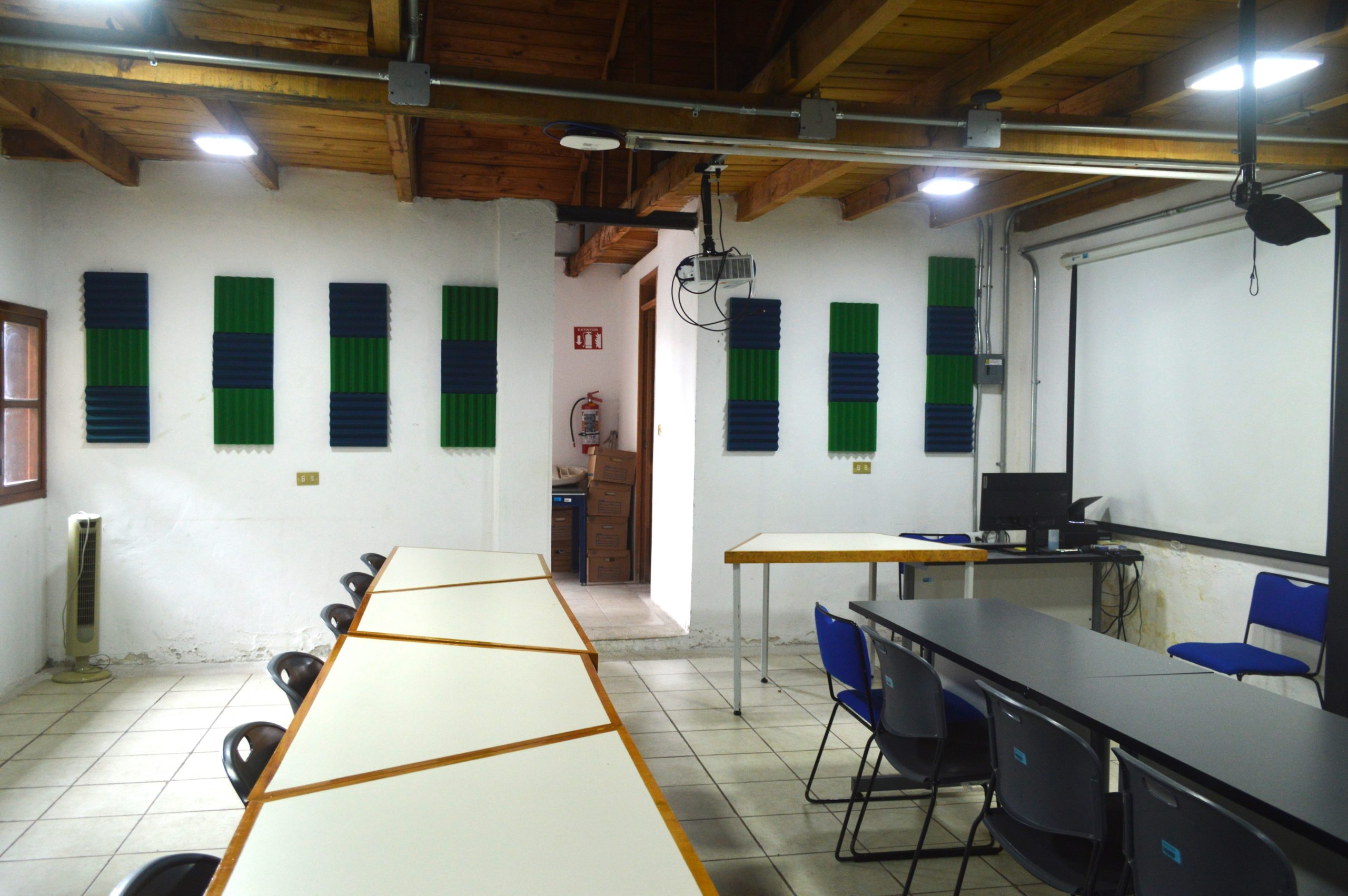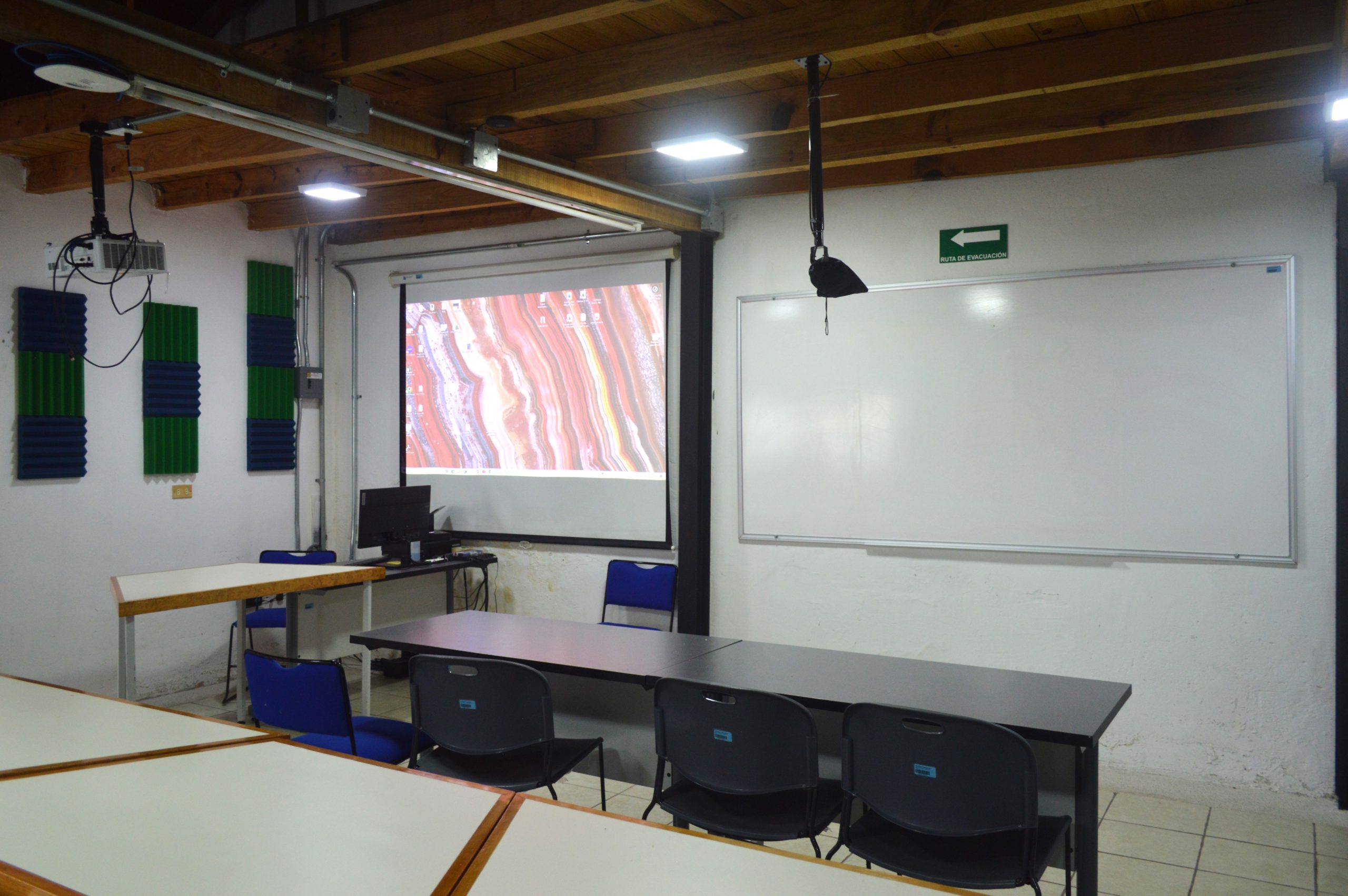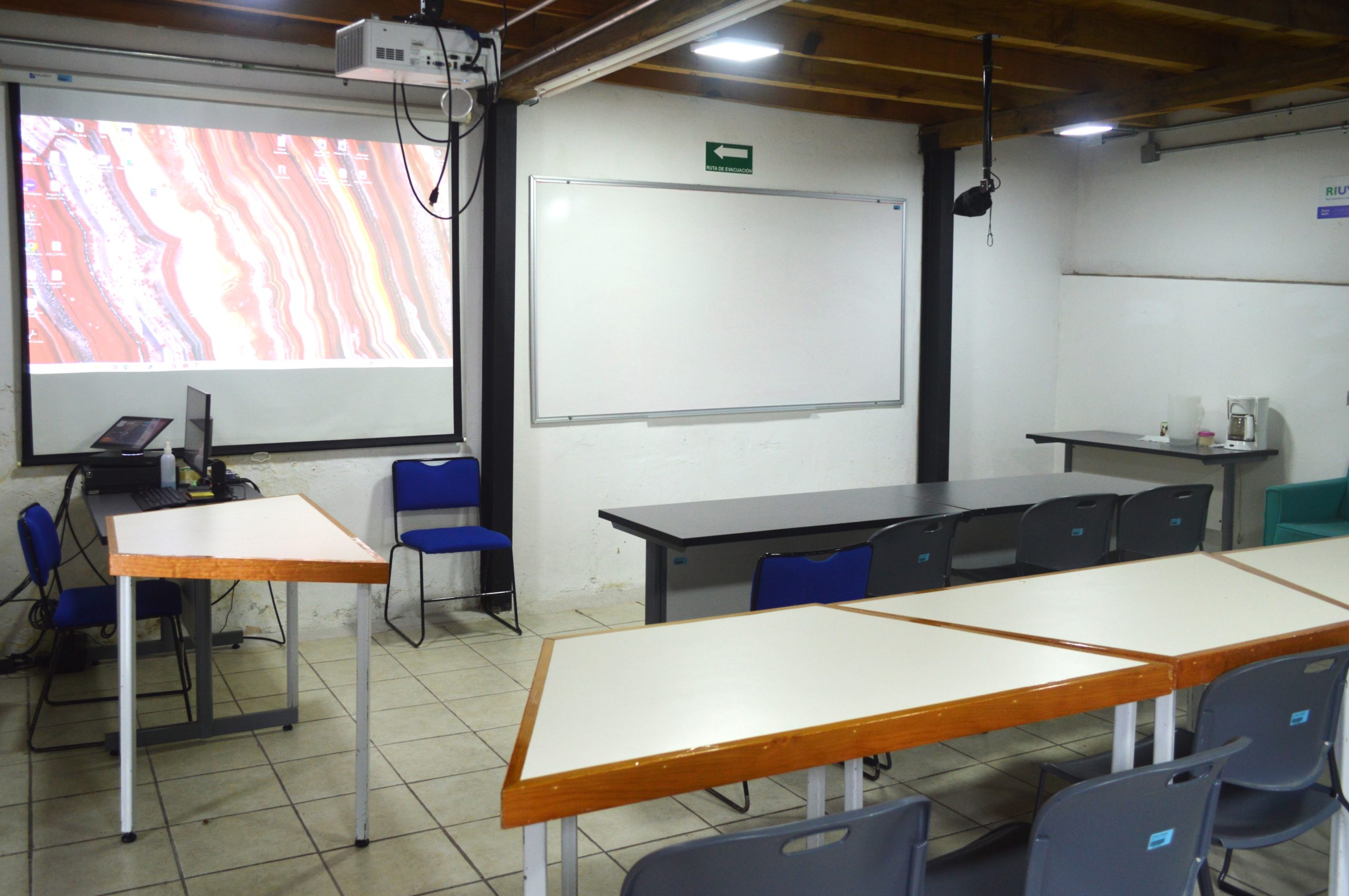 En la parte de atrás se encuentra el aula híbrida que cuenta con mesas y sillas, pizarrón, proyector, controlador para videoconferencia, computadora de escritorio, televisión, sistema de audio y sistema de video. Actualmente sirve como salón de clases para los estudiantes de la Especialización en Promoción de la Lectura.