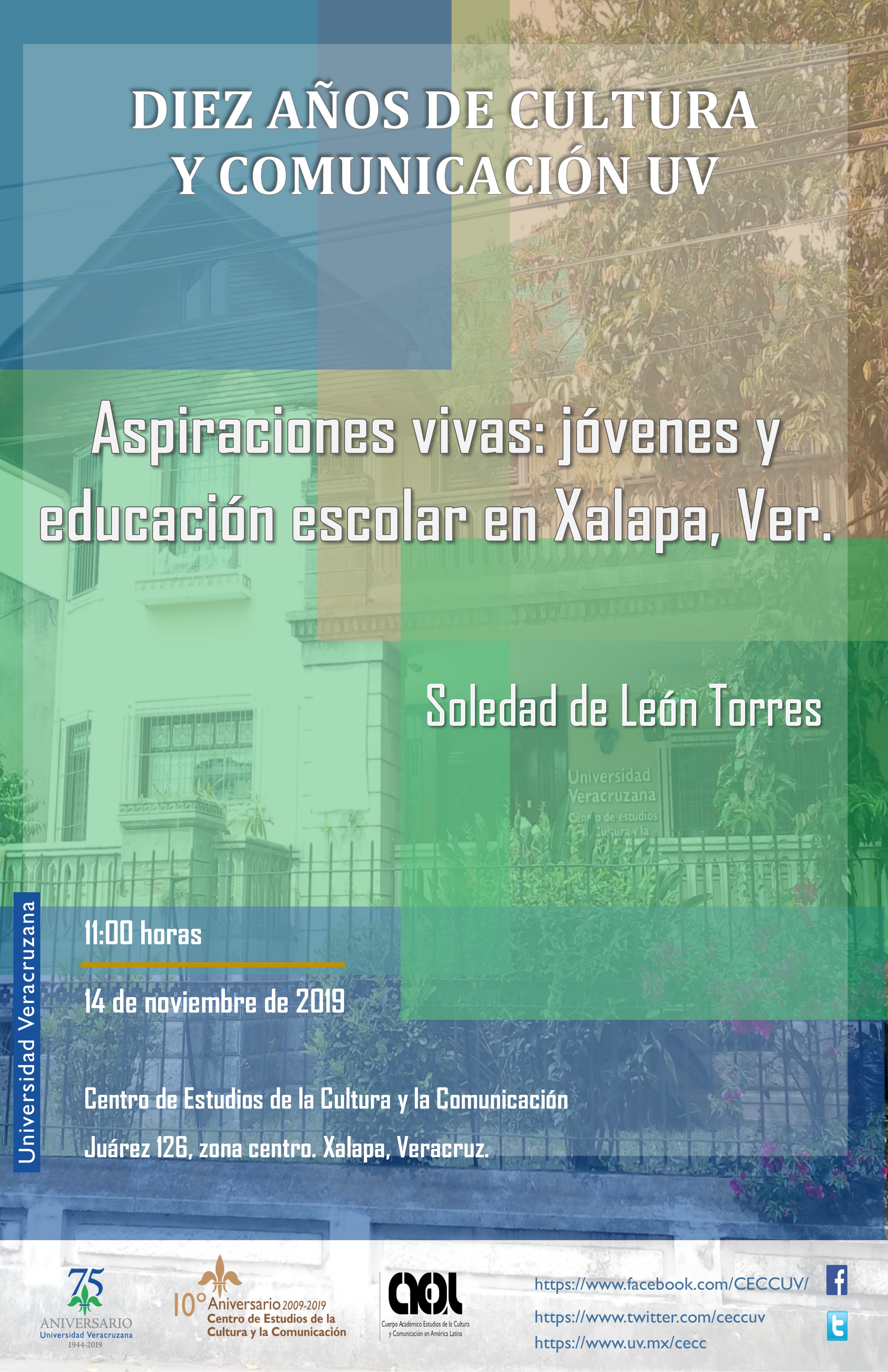 La Dra. Soledad de León Torres presentará: «Aspiraciones vivas: jóvenes y educación escolar en Xalapa, Ver.», los esperamos este jueves 14 de noviembre a las 11:00 horas en Juárez 126, Col. Centro, Xalapa, Ver.