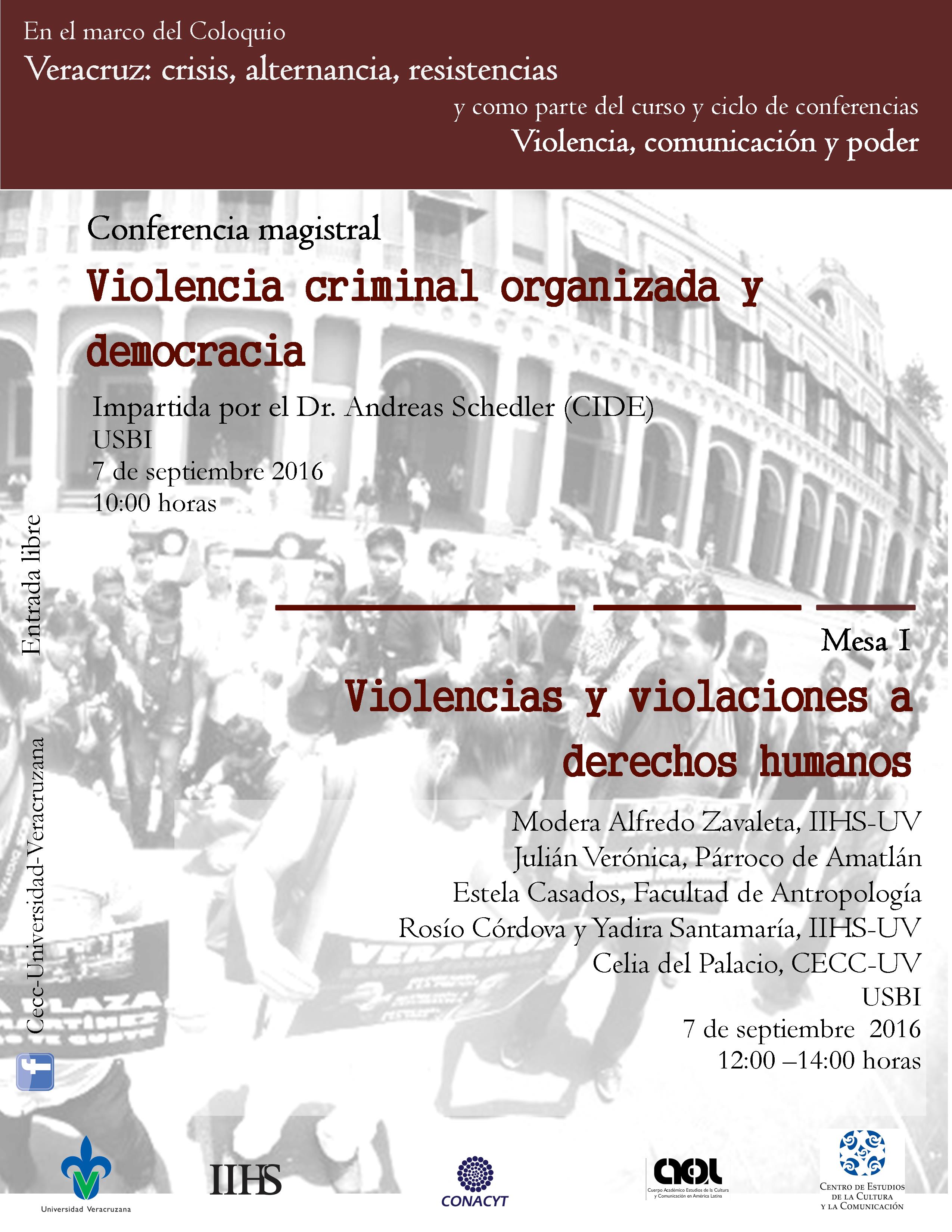El coloquio Veracruz: crisis, alternancias y resistencias tiene como objetivo crear un foro crítico y de construcción de propuestas desde la academia y la sociedad. Las mesas engloban temas sobre violaciones a los derechos humanos, pobreza, desigualdad, régimen político y elecciones, corrupción y desempeño en los gobiernos locales, entre otros. Y como parte del curso y ciclo de conferencias Violencia, comunicación y poder, que se organizan en el CECC, se les invita a la conferencia magistral del Dr. Andreas Schedler y a la Mesa 1 Violencias y violaciones a derechos humanos.