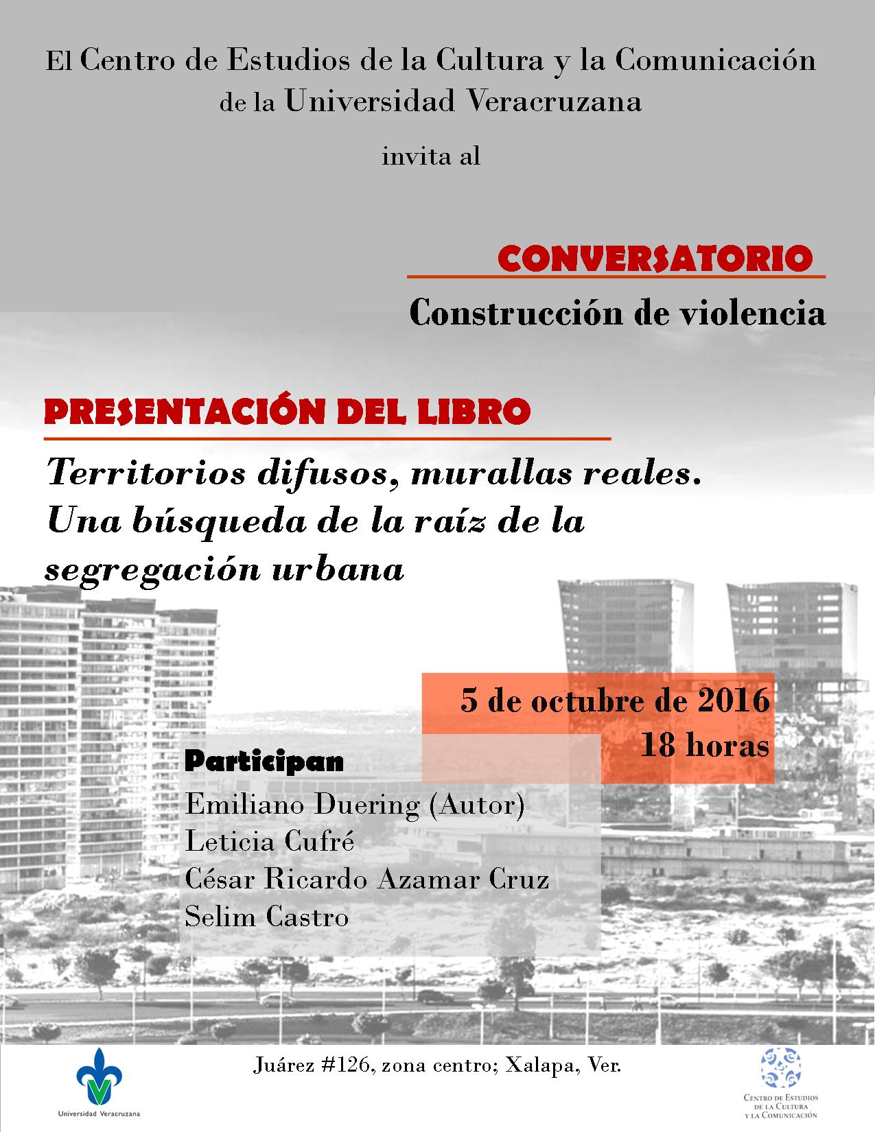 Comenzamos la semana haciéndole esta invitación por parte del Centro de Estudios de la Cultura y la Comunicación de la Universidad Veracruzana que llevará a cabo dos actividades este próximo miércoles 5 de octubre de 2016. A las 10 horas, en el marco del curso «Violencia Comunicación y poder», se impartirá la conferencia «Diagnóstico y percepción de violencias en colonias marginales» por la Dra. Leticia Cufré Marchetto (CECCUV) y el Dr. Emiliano Duering (Universidad Autónoma de Querétaro) y a las 18 horas, el conversatorio «Construcción de violencia» y la presentación del libro Territorios difusos, murallas reales. Una búsqueda de la raíz de la segregación urbana. En la que participarán Emiliano Duering (Autor), Leticia Cufré Marchetto, César Ricardo Azama Cruz y Selim Castro.