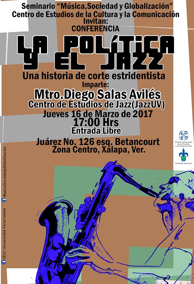 Es en este marco que se ha organizado la conferencia “La política y el Jazz. Una historia de corte estridentista”. Que será impartida por Diego Salas Avilés, coordinador del Taller de crítica musical orientada al jazz. Actualmente es profesor del Centro de Estudios de Jazz de la Universidad Veracruzana y se ha desarrollado como escritor creativo y músico en grupos de jazz tradicional y fusión.