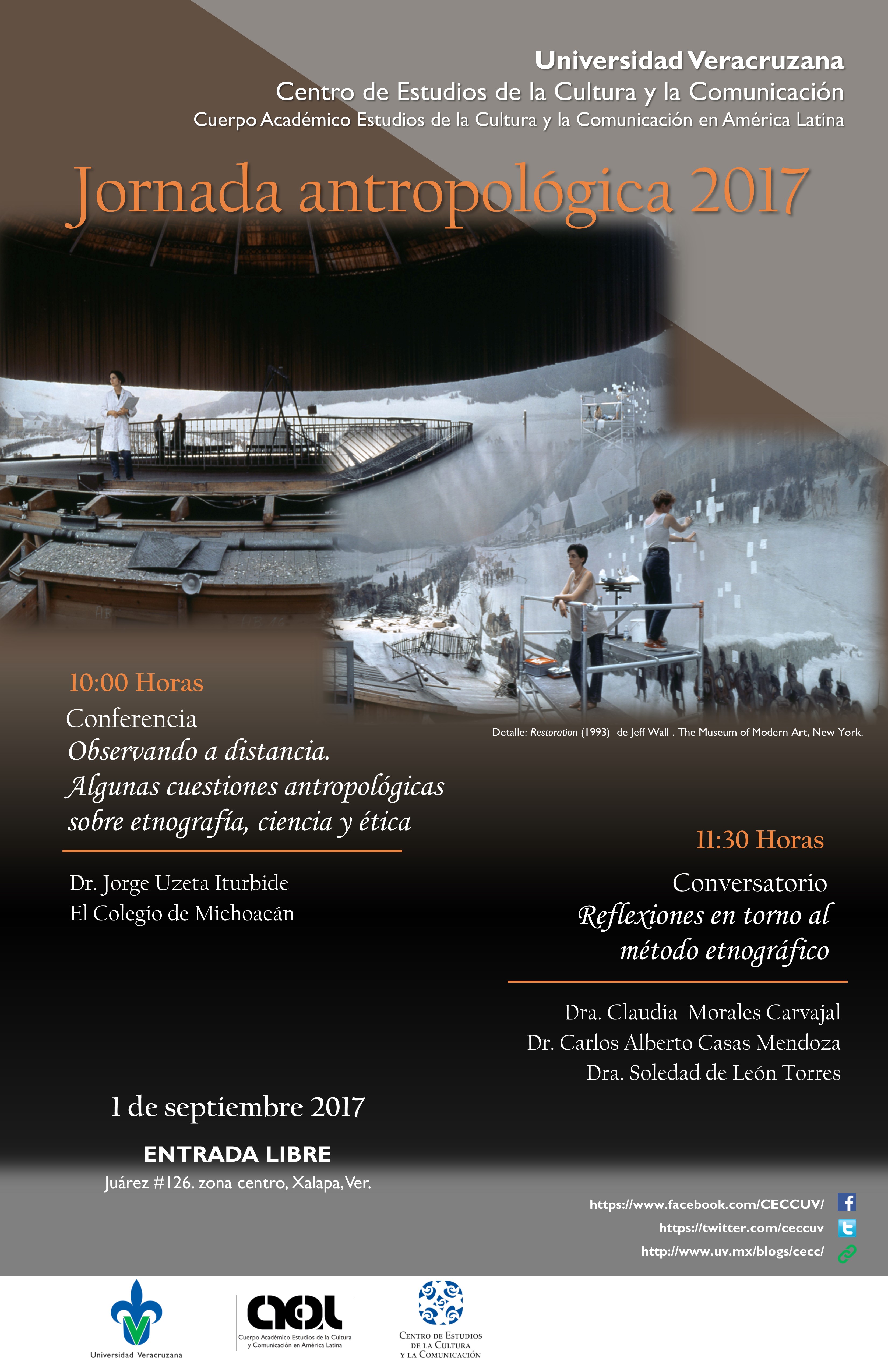 El 1 de septiembre de 2017, a las 10 de la mañana, el Dr. Jorge Uzeta Iturbide (El Colegio de Michoacán) impartirá la conferencia magistral Observando a distancia. Algunas cuestiones antropológicas sobre etnografía, ciencia y ética. La discusión del investigador va sobre el papel del antropólogo en campo y sobre sus relaciones con los sujetos a los que llega a importunar para estudiar las prácticas y los múltiples procesos e interconexiones que le interesan, algo que sigue siendo de gran relevancia para la disciplina. El especialista establece que esto lo es al menos por tres razones: primero porque se levanta sobre la concepción clásica y aún en boga de trabajo de campo; enseguida, porque las representaciones etnográficas elaboradas tienen implicaciones tanto científicas como éticas y, finalmente, por el perfil intrínsecamente político de su trabajo.