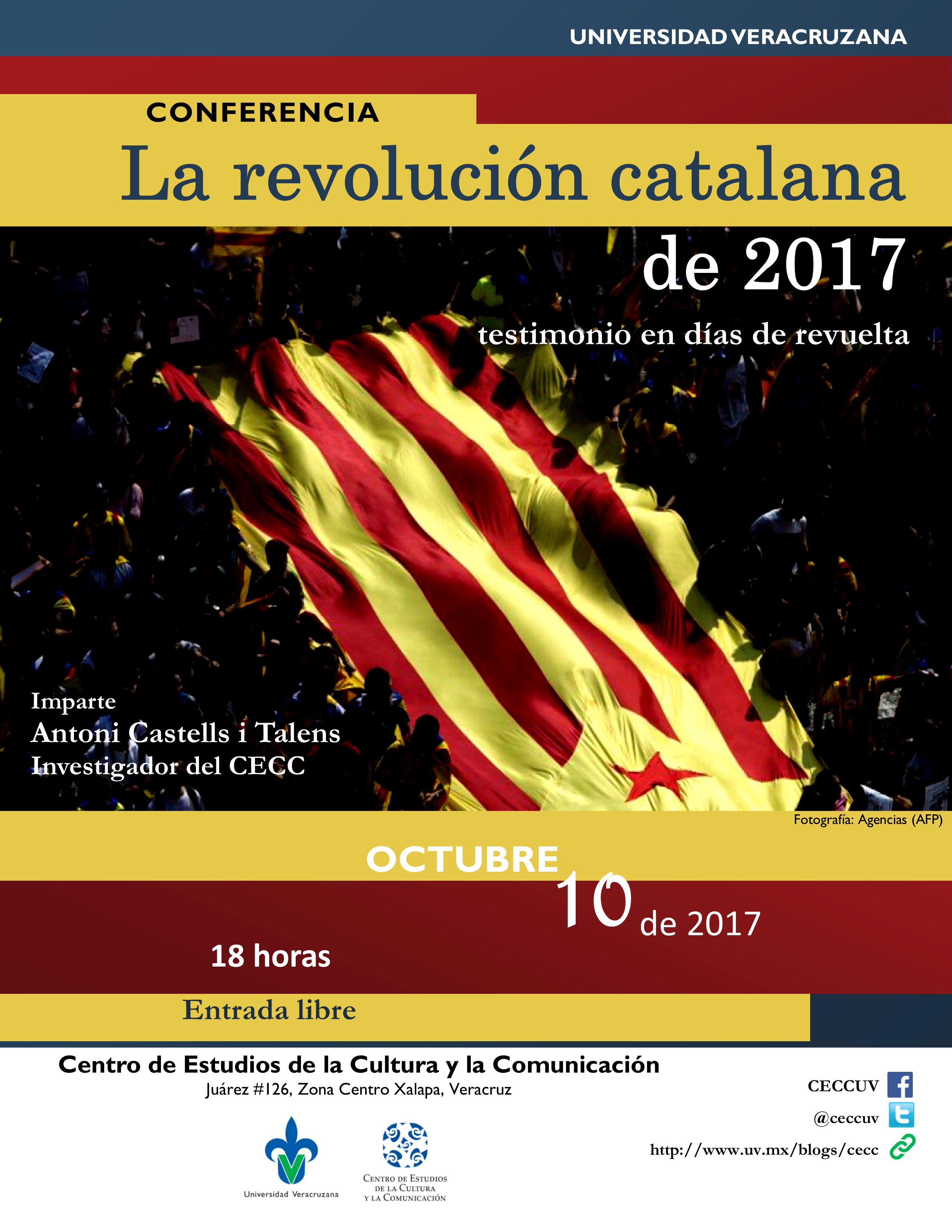 El Centro de Estudios de la Cultura y la Comunicación, desde su línea de investigación: Identidad, cultura y poder, invita a la conferencia «La revolución catalana de 2017» que será impartida por el Dr. Antoni Castells i Talens, investigador del CECC que estuvo presente durante los sucesos históricos. El investigador explicará, a manera de testimonio, los puntos esenciales para entender el conflicto que se desarrolla entre España y Cataluña.