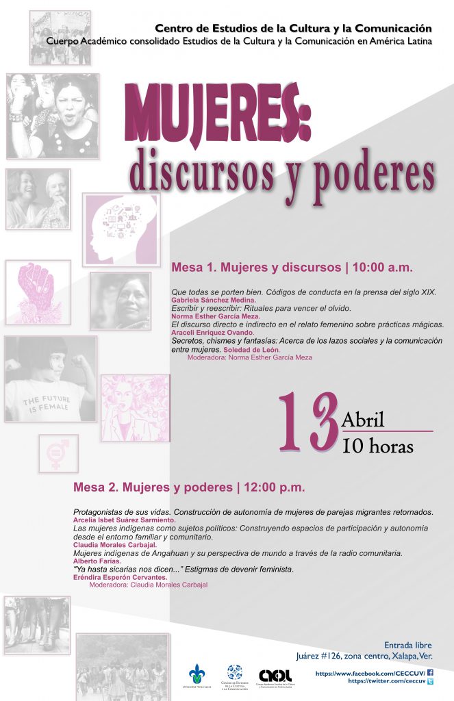 El Centro de Estudios de la Cultura y la Comunicación, a través del Cuerpo Académico Consolidado «Estudios de la Cultura y la Comunicación» invitan a las mesas Mujeres: discursos y poderes que se realizarán el 13 de abril de 2018 a partir de las 10 horas.