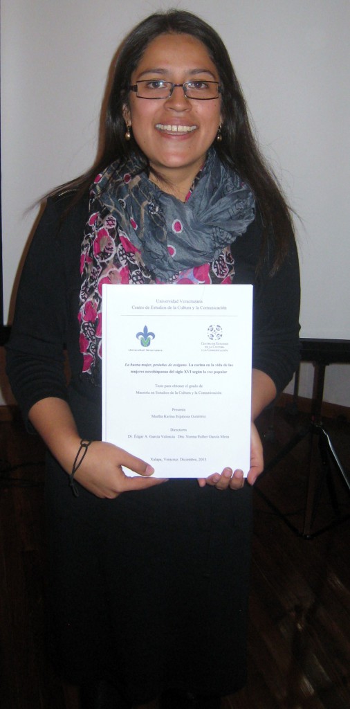 Ella presentó la tesis intitulada » «La buena mujer, pestañas de orégano. La cocina en la vida de las mujeres novohispanas del siglo XVI según la voz popular», obteniendo el grado de Maestra en Estudios de la Cultura y la Comunicación con mención honorífica, asesorada por los investigadores del CECC, la Dra. Norma Esther García Meza y el Dr. Édgar Alejandro García Valencia.