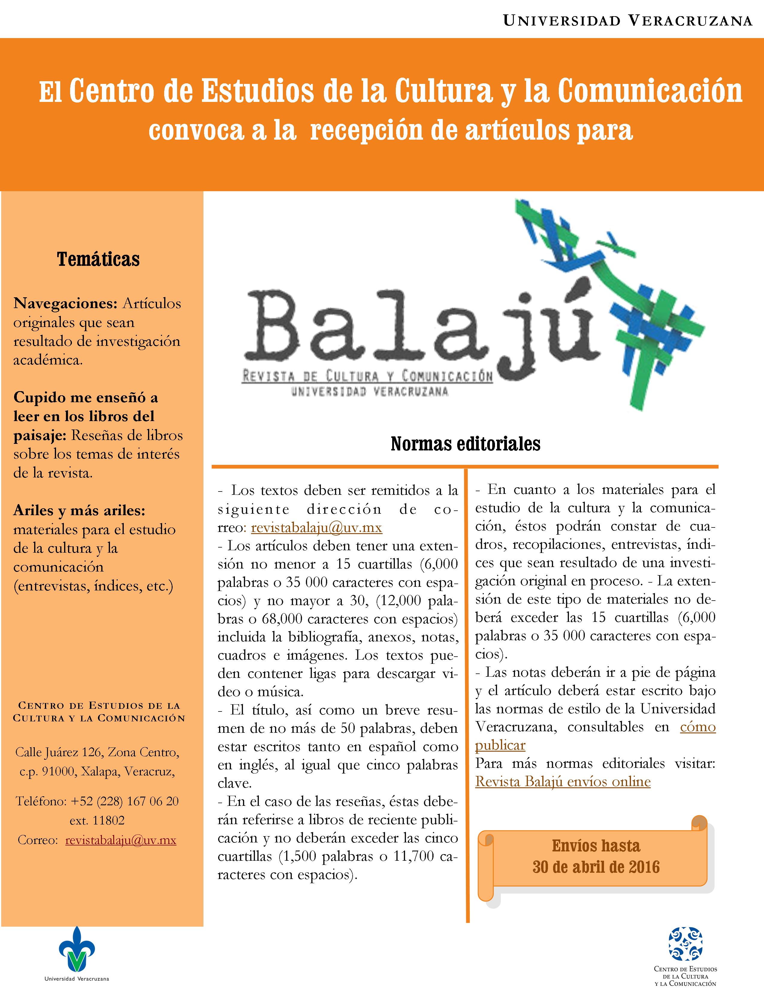 El Centro de Estudios de la Cultura y la Comunicación invita a toda la comunidad universitaria, ex alumnos, investigadores y profesores a enviar artículos para publicar en el próximo número de Balajú, revista de cultura y comunicación de la Universidad Veracruzana.