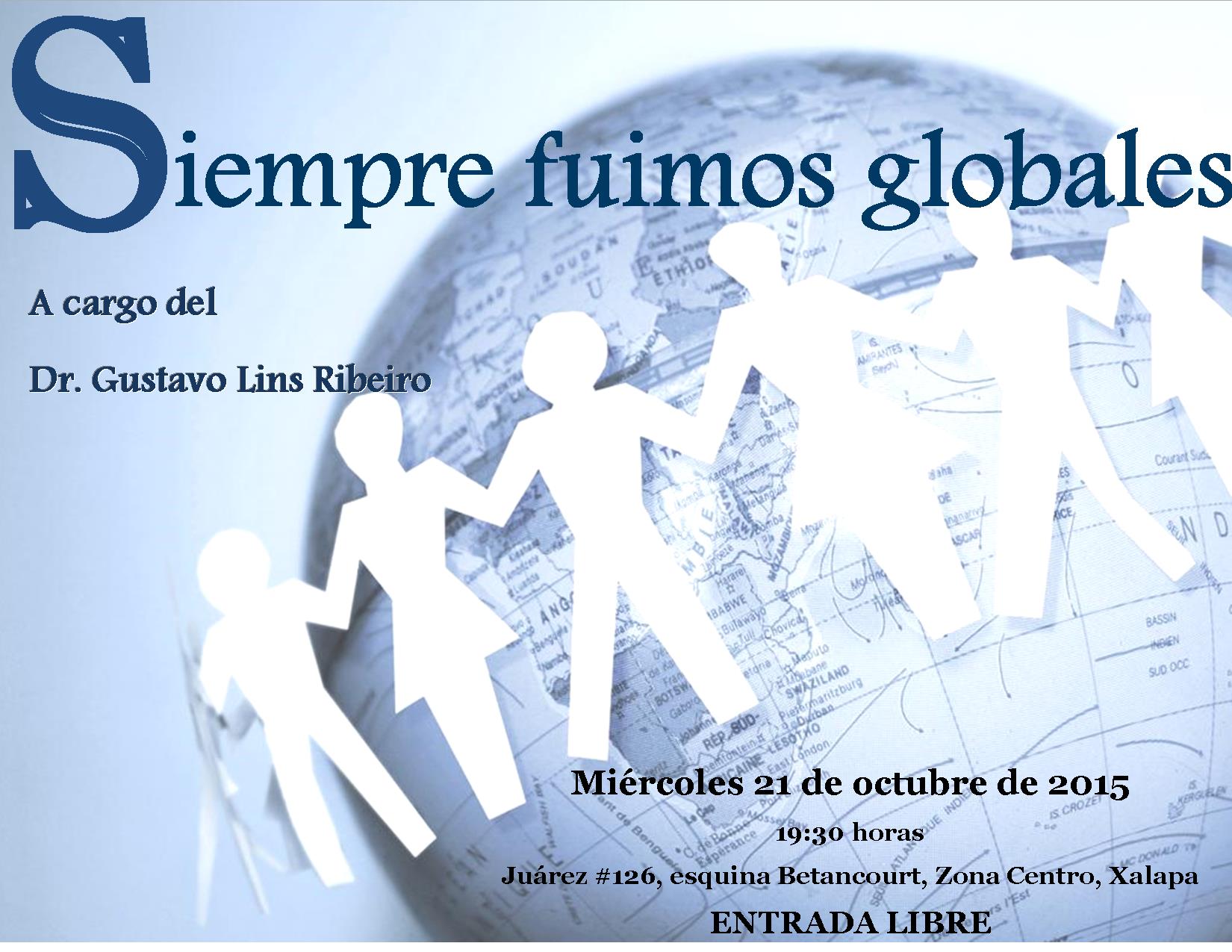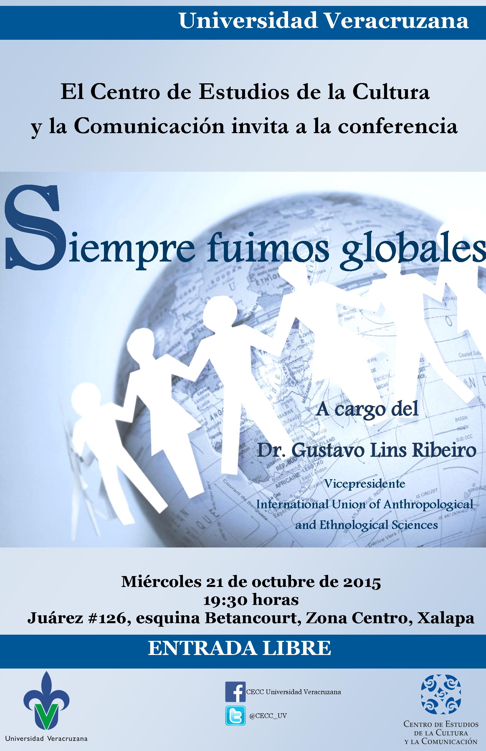La conferencia será impartida por Gustavo Lins Ribeiro quien es Doctor en Antropología (Universidad de Nueva York). Es profesor titular de la Cátedra Palerm Ángel de la Universidad Autónoma Metropolitana de Iztapalapa, académico distinguido del Departamento de la Universidad Iberoamericana, investigador asociado senior del Departamento de Antropología de la Universidade de Brasília y vicepresidente de la International Union of Anthropological and Ethnological Sciences – IUAES. Ha realizado investigaciones y escrito sobre temas como el desarrollo, ecologismo, migración internacional, cibercultura, globalización y transnacionalismo.