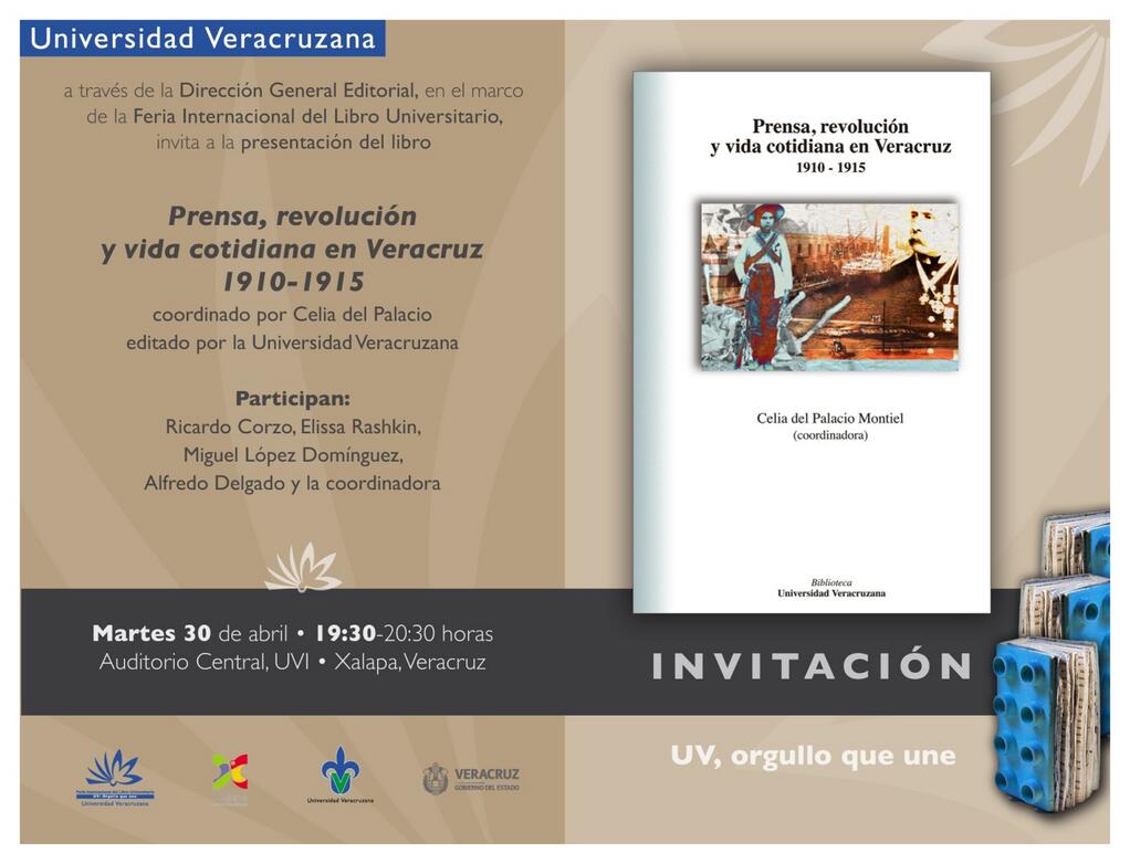 Se hace una cordial invitación a la presentación de la novedad editorial Prensa, revolución y vida cotidiana en Veracruz, 1910-1915. Coordinado por Celia del Palacio Montiel y publicado por la Universidad Veracruzana.Los trabajos que componen el volumen son los siguientes: