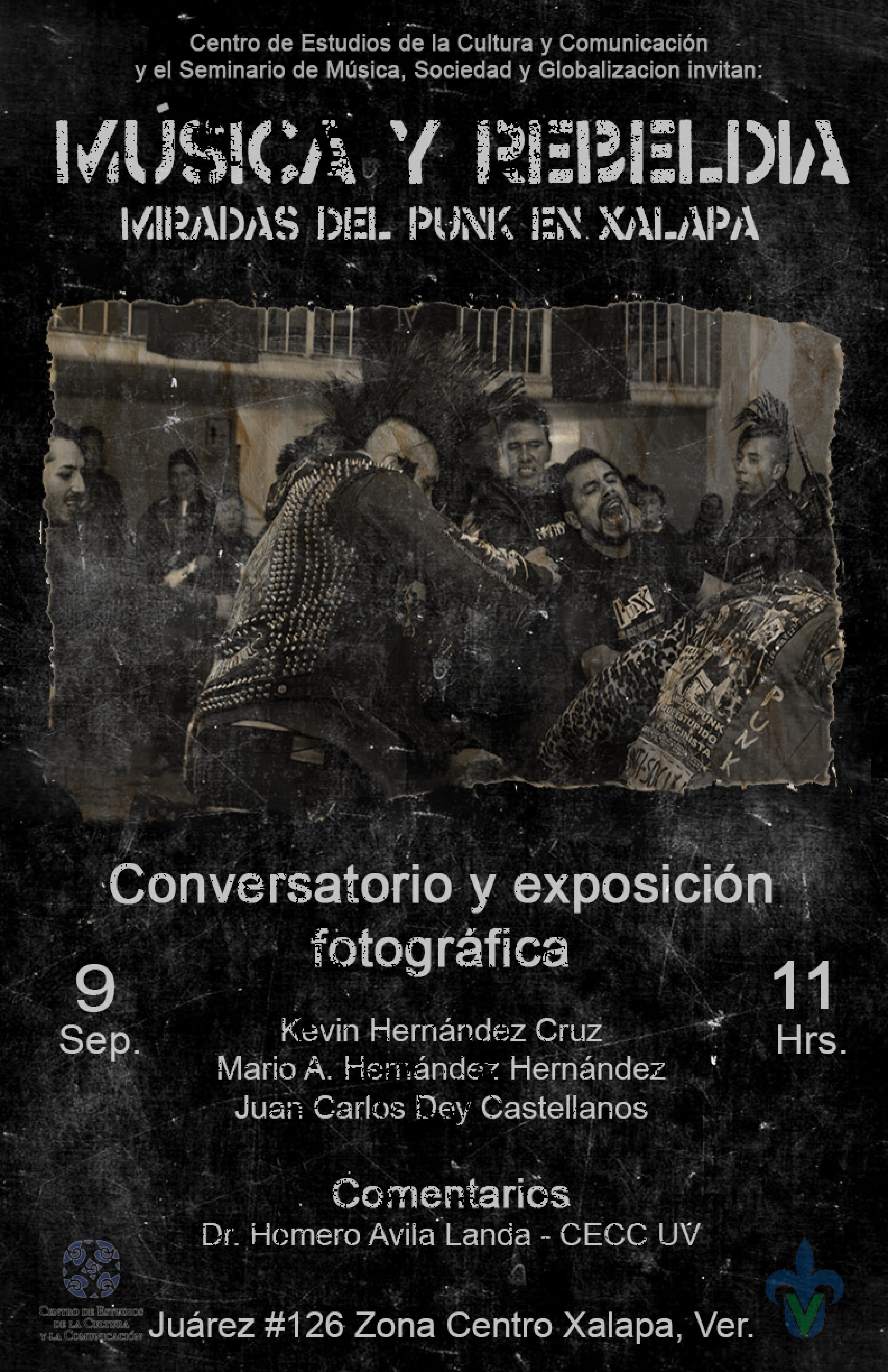 Como parte del Seminario de Música, Sociedad y Globalización, se presenta el conversatorio y exposición fotográfica “Música y rebeldía: miradas del punk en Xalapa”. Este es el resultado de una investigación independiente por parte de Juan Carlos Dey Castellanos, Mario Hernández Hernández alumnos de la facultad de Publicidad y Relaciones Publicas y de Kevin Manuel Hernández Cruz de la facultad de sociología, con el apoyo del Dr. Homero Ávila Landa, coordinador del posgrado en Estudios de la Cultura y la Comunicación.