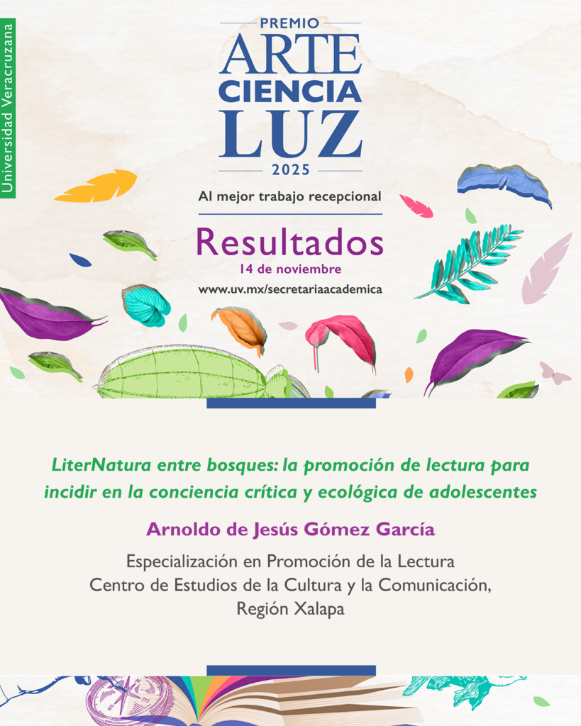 Felicitamos a Arnoldo de Jesús Gómez García, egresado de la Décima Primera Generación (2023-2024) de la Especialización en Promoción de la Lectura, por ganar el Premio «Arte, Ciencia y Luz» al mejor trabajo recepcional a nivel Especialización con su trabajo recepcional: “Liternatura entre bosques: la promoción de lectura para incidir en la conciencia crítica y ecológica de adolescentes”, codirigida por la Dra. Elsa Margarita Ramírez Leyva y el Dr. Mario Miguel Ojeda Ramírez, a quienes también les damos nuestras felicitaciones ✨