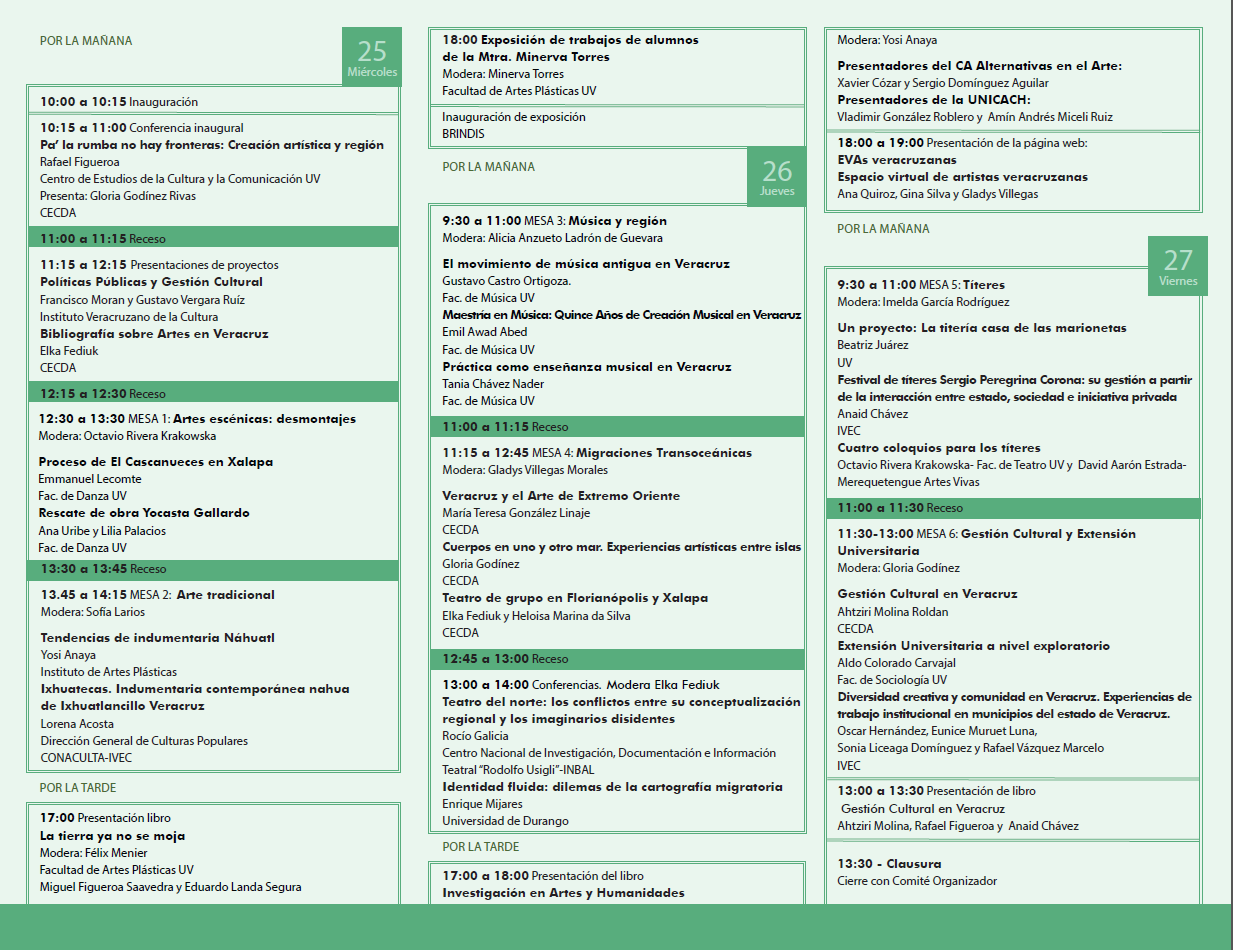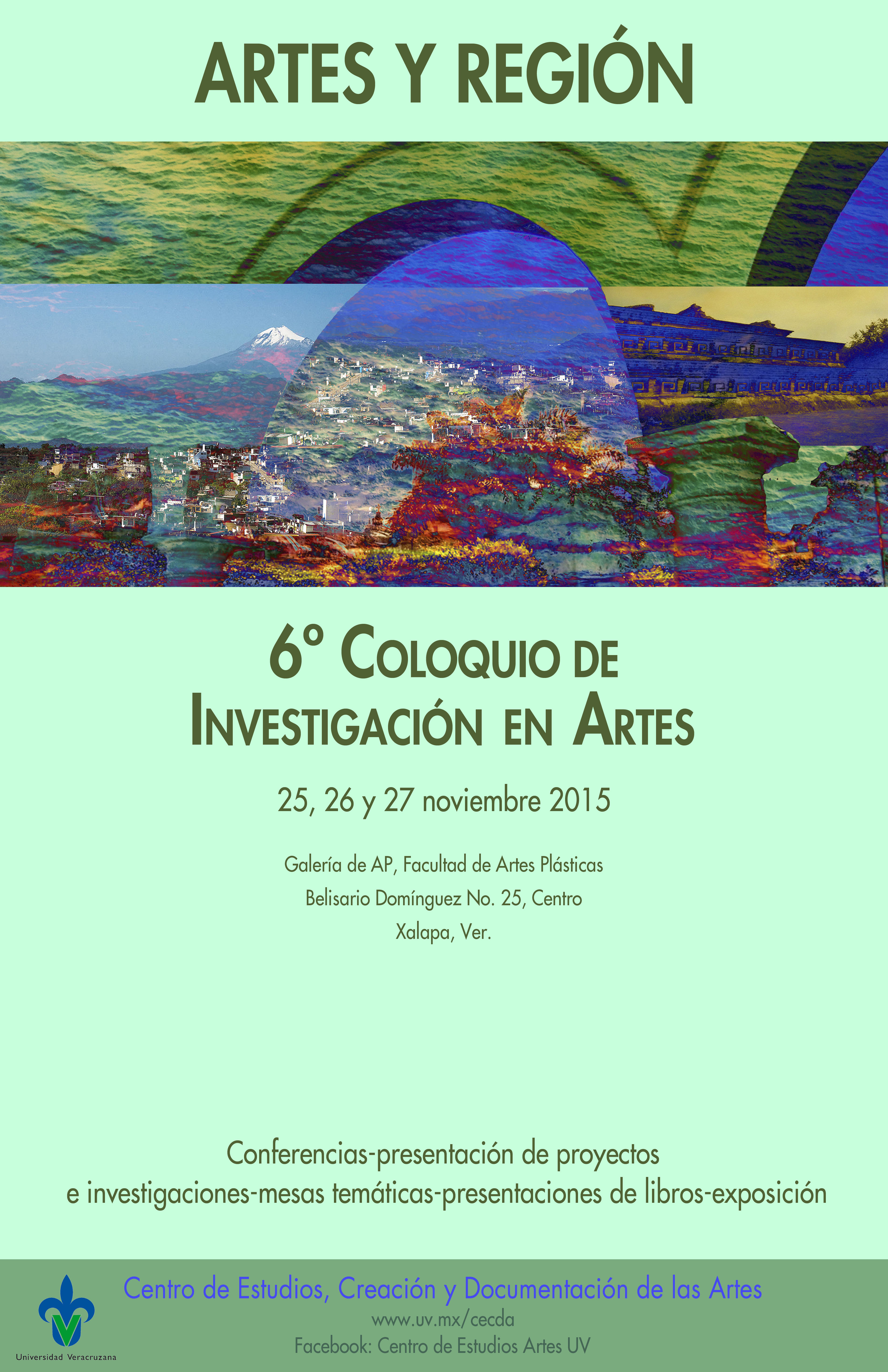 El Centro de Estudios, Creación y Documentación de la Artes (CECDA), con sus dos años de existencia, continúa la tradición iniciada en 2008 dentro del Programa de Investigación en Artes, organizando coloquios interdisciplinarios para compartir los resultados y avances de las investigaciones que desarrollan los cuerpos académicos de la Universidad Veracruzana y cuenta con invitados que aportan perspectivas complementarias en temas de relevancia teórico conceptual y de la praxis artística. El 6to Coloquio de Investigación en Artes dirige la atención hacia la regionalización como una perspectiva cartográfica en el estudio de los fenómenos, las prácticas y las técnicas artísticas, con el interés de reflexionar sobre la construcción teórica del concepto “región” y sobre los hallazgos en el estudio dentro de la Línea “Artes en Veracruz”.