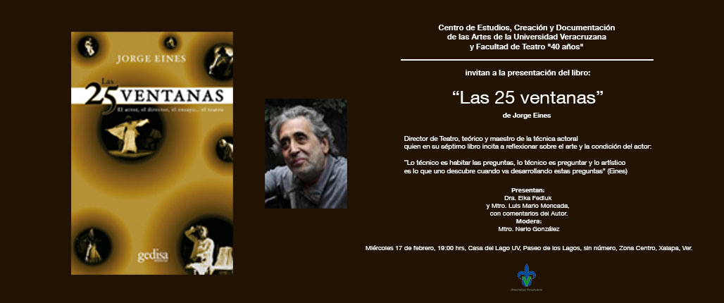 El Centro de Estudios, Creación y Documentación de las Artes y la Facultad de Teatro «40 años» le invitan a la presentación del libro «las 25 ventanas» del autor Jorge Eines el próximo miércoles 17 de febrero en el Centro Cultural Casa del Lago, 19:00 Hrs.