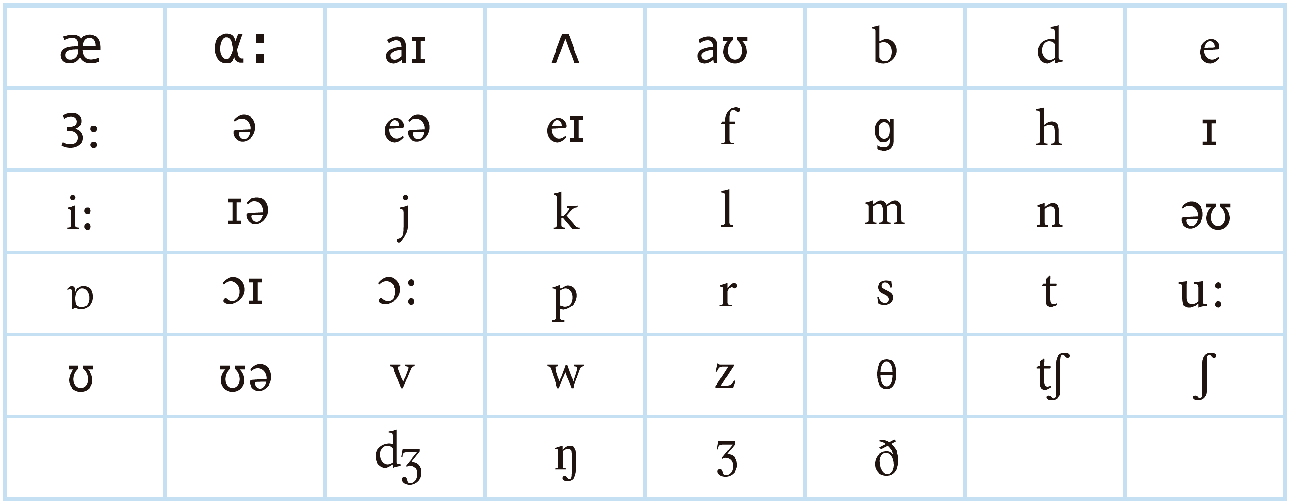 The following is a chart with the phonetic symbols that correspond to the vowel and consonant sounds: