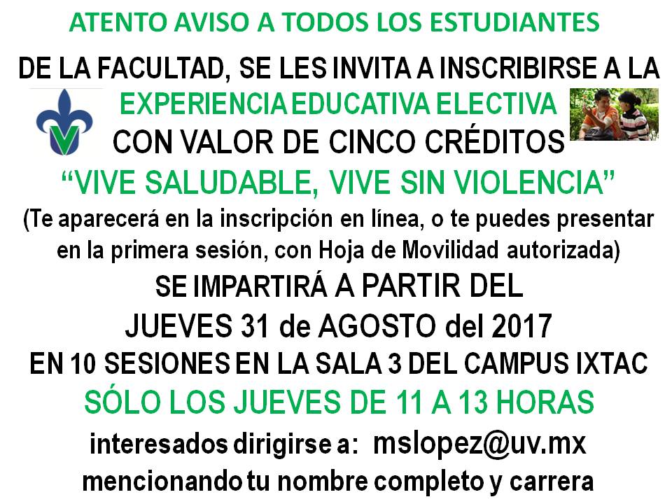 E.E.: VIVE SALUDABLE VIVE SIN VIOLENCIA Periodo Agosto-diciembre 2017 Los días jueves de 11:00 a 13:00 horas Región Ixtaczoquitlán |