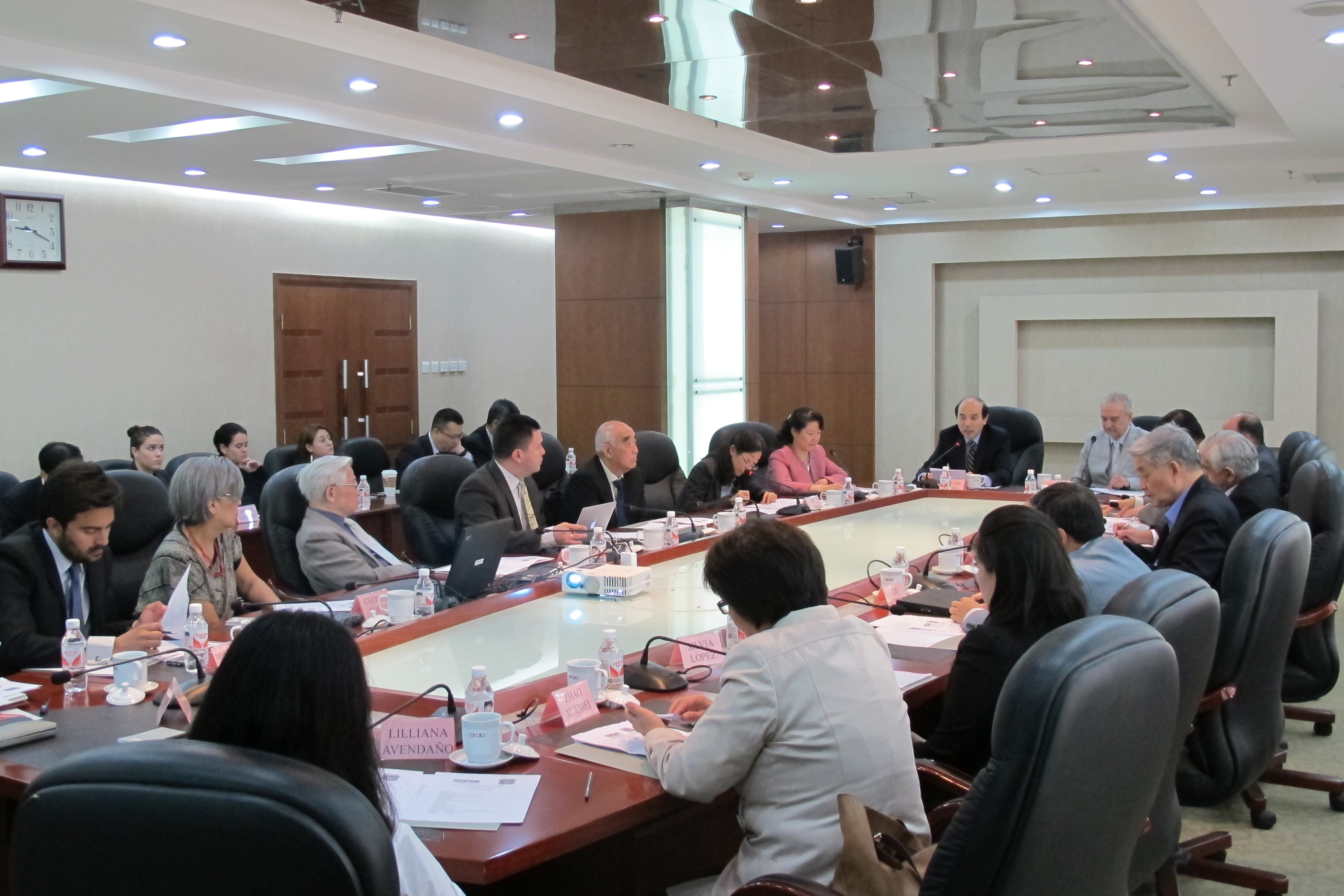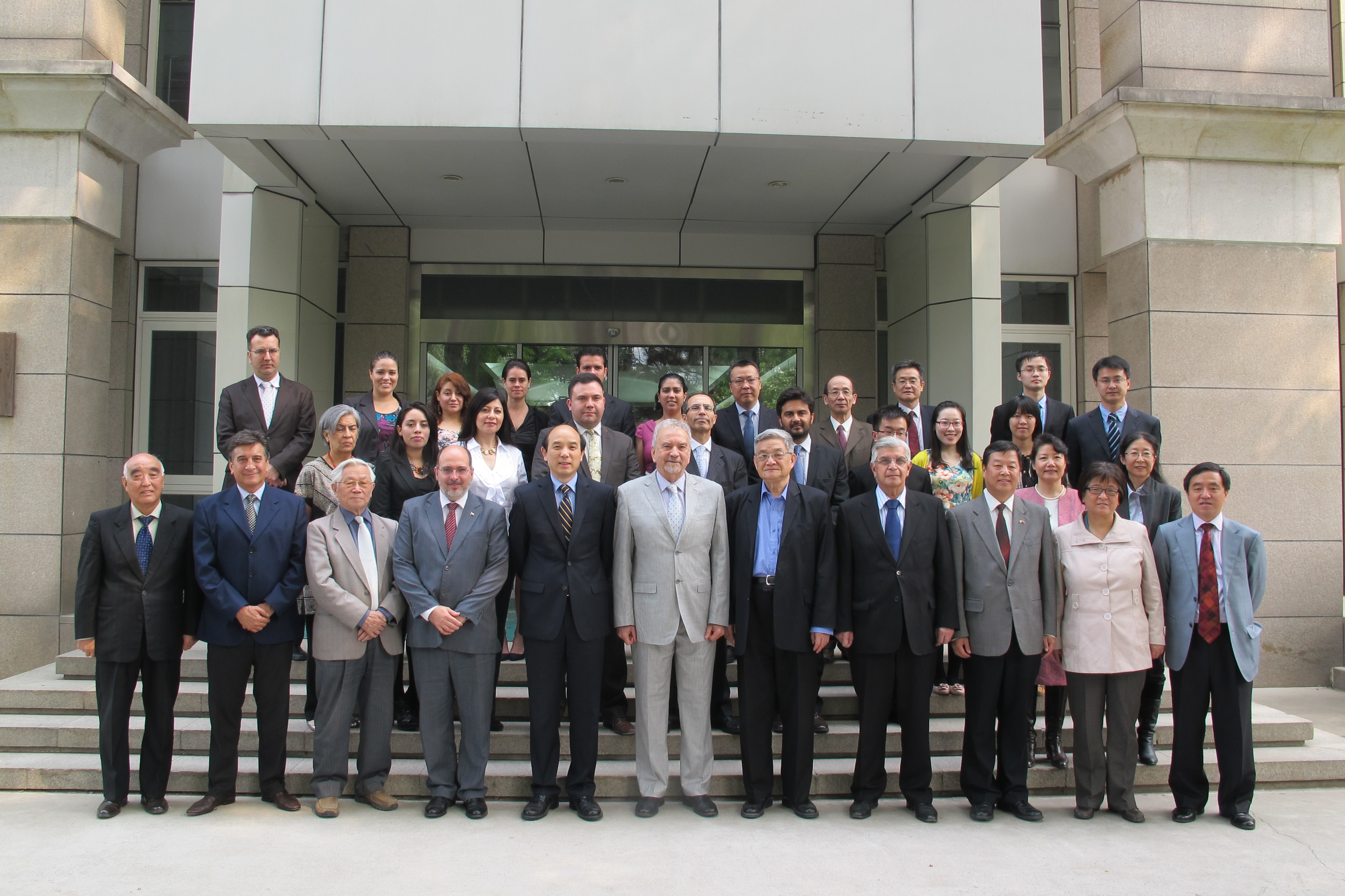 De derecha a izquierda en la primer fila aparecen el Sr. Liu Jian, Decano de la Facultad de Español y Portugués de la Universidad de Estudios Extranjeros de Beijing; la Sra. Zhao Xuemei, Directora del Centro de Estudios Latinoamericanos, Instituto de Estudios de Regiones y Países, Universidad de Economía y Comercio Exterior de Beijing; Sr. Zeng Gang, Ex embajador chino en México, Argentina y Bolivia, Director del Centro de Estudios de México de la Academia de Ciencias Sociales de China; Sr. Patricio Cifuentes Araya, Primer Secretario de la Embajada de Chile en China; Sr. Xu Shicheng, Miembro Honorario e Investigador del Instituto de Estudios Latinoamericanos de la Academia de Ciencias Sociales de China; Sr. Aníbal Zottele, Coordinador del Centro de Estudios China-Veracruz, Universidad Veracruzana; Sr. Yuan Peng, Vicepresidente de CICIR; Sr. Alberto J. Blanco Silva, Embajador de Cuba en China; Sr. Huang Zhiliang, Ex embajador chino en Venezuela y Nicaragua; Sr. Guillermo Pulido, Director del Centro de Estudios Mexicanos de la UNAM, en la Universidad de Estudios Extranjeros de Beijing; Sr. Wu Changsheng, Ex embajador chino en Colombia, Director del Centro de Estudios Latinoamericanos, Fundación de Estudios Internacionales de China; Sra. Li Meng, Investigadora Asociada del Instituto de Estudios de América Latina de CICIR; Sra. Wu Hongying, Directora del Instituto de Estudios de América Latina de CICIR; Sra. Cao Ting, Investigadora Asistente del Instituto de Estudios de América Latina de CICIR; Sr. José David Murillo, Consejero Cultural de la Embajada de Costa Rica en China; Sr. Alberto Limas, Consejero Económico de la Embajada de México en China; Sra. Lilliana Avendaño Miranda, Universidad Veracruzana; Sra. Silvia Carolina López Rocha, Universidad Veracruzana; Sra. Martha López Peredo, Universidad Veracruzana; Sr. Sun Yanfeng, Director Adjunto del Instituto del Instituto de Estudios de América Latina de CICIR; Sr. Esteban Zottele, Universidad Veracruzana; Sra. Deni Aguilar, Centro de Estudios Mexicanos de la UNAM, en la Universidad de Estudios Extranjeros de Beijing; Sra. Mónica Lebarón, Centro de Estudios Mexicanos de la UNAM, en la Universidad de Estudios Extranjeros de Beijing; Sr. Huang Zhong y Sr. Yan Jin del Instituto de Estudios de América Latina de CICIR.