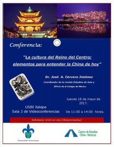 El Centro de Estudios China-Veracruz de la Universidad Veracruzana invita este jueves 18 de mayo a las 11:00 am en la sala de videoconferencia no. 3 de la USBI Xalapa, a la conferencia “La cultura del Reino del Centro: elementos para entender la China de hoy” Dictará el Dr. José A. Cervera Jiménez coordinador de la Revista Estudios en Asia y África de El Colegio de México.
