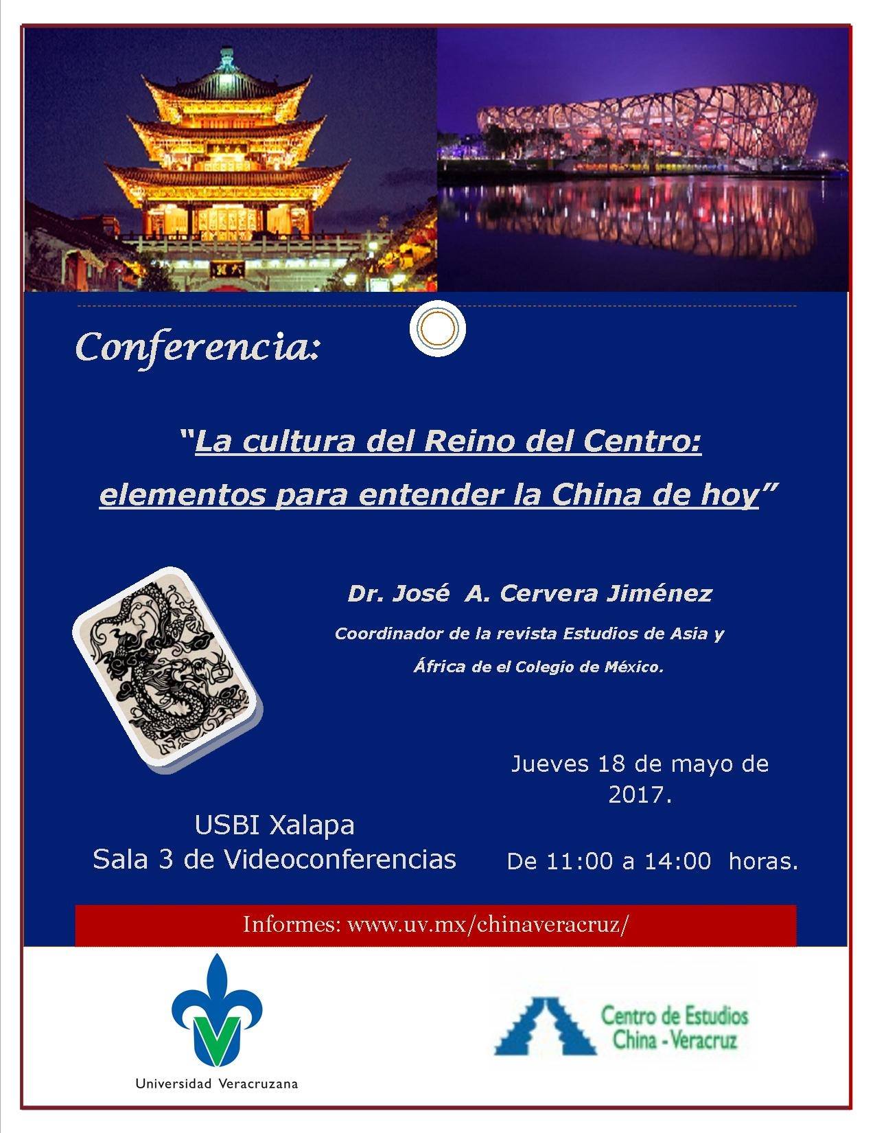 El Centro de Estudios China-Veracruz de la Universidad Veracruzana invita este jueves 18 de mayo a las 11:00 am en la sala de videoconferencia no. 3 de la USBI Xalapa, a la conferencia “La cultura del Reino del Centro: elementos para entender la China de hoy” Dictará el Dr. José A. Cervera Jiménez coordinador de la Revista Estudios en Asia y África de El Colegio de México.