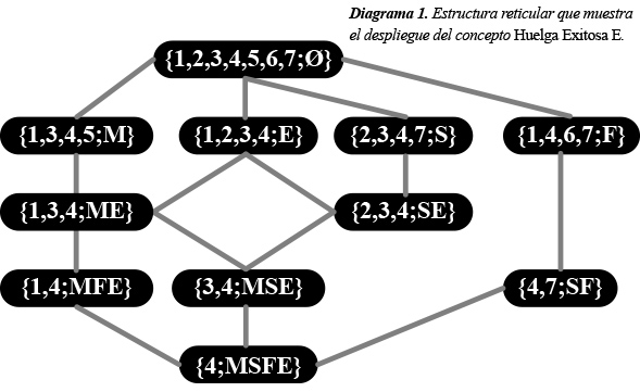 El diagrama reticular se interpreta de la siguiente manera. Se define un concepto como un par ordenado, en el cual la primera parte del par representa los objetos designados por el concepto, y la segunda parte contiene los atributos definitorios de esos objetos, todo ello en un orden jerárquico. Por ejemplo, considere el par {1,2,3,4; E}, que indica que el concepto Huelga Exitosa, representado por la letra E, es un atributo de los objetos 1,2,3 y 4, lo cual puede corroborarse en la Tabla. Estos casos se subdividen, por un lado, en {1,3,4; ME}, que corresponde a los casos en los cuales las huelga fue exitosa y se dan condiciones de mercado favorables, M; y, por otro lado, en {2,3,4; SE} aquéllos en los cuales una huelga exitosa se asocia con la posibilidad de huelgas de solidaridad. En la misma forma pueden interpretarse los otros elementos de la estructura. Una posible conclusión –que podría tomarse como una hipótesis por el sociólogo– sería que las huelgas exitosas tuvieron lugar cuando había condiciones de mercado favorables y podían presentarse huelgas de solidaridad.