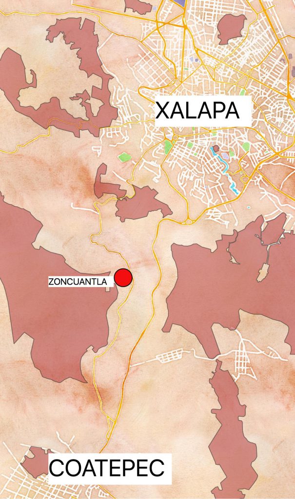 Entre Xalapa y Coatepec, a una altura media en la montaña, se encuentra Zoncuantla. En su reseña histórica sobre la vida de Coatepec (1948), el doctor Rafael Sánchez Altamirano cuenta que: “La congregación o ranchería de Zoncuantla está ubicada a cinco kilómetros al norte de Coatepec en un ancho valle que recorre de poniente a oriente el río Pizquiac, y su jurisdicción comprende el antiguo rancho de Briones, en la margen sur del llamado río Sordo, que sólo dista cuatro kilómetros de la ciudad de Jalapa.”