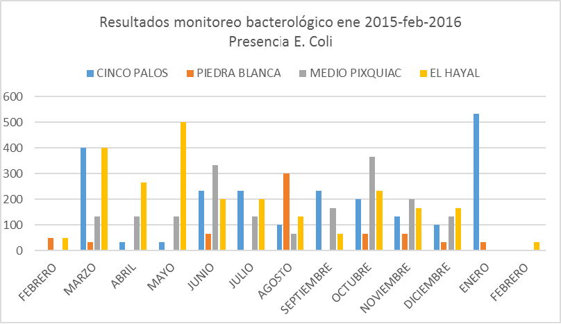 Referente a los datos sobre la presencia o ausencia de coliformes fecales, los cuatro sitios presentan condiciones dentro de las normas internacionales, por debajo de las 500 UFC/100 mL (UFC: Unidades Formadoras de Colonias). Lo anterior refleja que el agua de los sitios muestreados no tiene aporte de contaminación fecal fuera de los rangos de un ecosistema sano, ya que los niveles de E. Coli están dentro de los límites máximos permisibles para playas recreativas en México y Estados Unidos, y esta agua tiene dicha bacteria porque seguramente es aportada por las prácticas agropecuarias río arriba o por la vida animal natural, siendo arrastrada por eventos de lluvia o por ganado que abreva directamente en el margen de los ríos y arroyos.