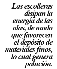 Contrariamente, en las playas modificadas, al presentar escolleras o estar delimitadas por la mancha urbana, cambia la acción de dichos factores, con lo cual se afecta su forma y composición. Las escolleras disipan la energía del oleaje, de modo que favorecen el depósito de materiales finos en los sedimentos en la playa, aumentando el porcentaje de lodos, la concentración de materia orgánica y, en general, favoreciendo la polución.