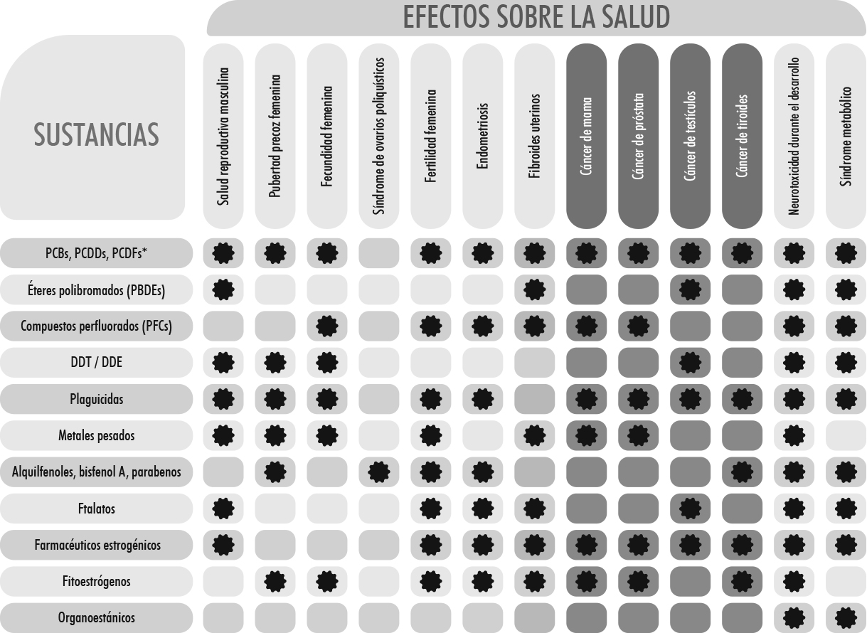 Los DE tienen múltiples efectos sobre la salud humana, entre los que destacan los daños a la reproducción masculina y femenina, las alteraciones en el desarrollo del sistema neurológico, enfermedades metabólicas y aumento en el riesgo de padecer cáncer. Las sustancias químicas pueden actuar, en las diversas etapas que comprende el proceso de la carcinogénesis, como iniciadoras o promotoras de tumores, siendo los DE considerados como promotores tumorales. Se ha demostrado que los compuestos arriba descritos provocan en las mujeres cáncer de mama, útero y ovarios; en los hombres cáncer de próstata, testículos y tiroides; aunque recientemente se les ha comenzado a relacionar también con el cáncer de pulmón, páncreas y riñón.