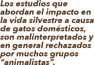 Los investigadores involucrados en esta temática observamos frecuentemente que los resultados de estudios científicos que abordan la depredación por gatos domésticos y su impacto en la vida silvestre son malinterpretados y generalmente rechazados por muchos grupos “animalistas”.