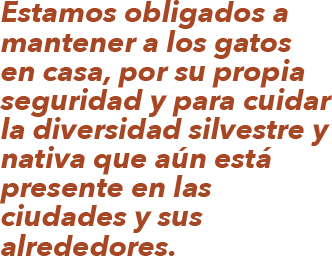 Creemos asimismo que los seres humanos debemos hacernos responsables de aquellas especies que domesticamos. El gato seguirá siendo el animal de compañía preferido por muchos, pero es necesario conceptualizar todos los beneficios y obligaciones que implica su tenencia responsable. Respondiendo a la pregunta inicial, podemos decir que estamos obligados a mantener a los gatos en casa, por su propia seguridad y al mismo tiempo para cuidar la diversidad silvestre y nativa que aún está presente en las ciudades y sus alrededores.