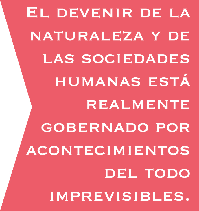 Tal y como la historia de la ciencia y la historia social nos muestran con toda claridad, el devenir de la naturaleza y de las sociedades humanas está realmente gobernado por acontecimientos del todo imprevisibles que rompen las expectativas y previsiones, con efectos que suelen dar un vuelco al orden y la regularidad generalmente supuestos por la ciencia ortodoxa.