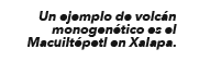 Entre los volcanes monogenéticos están los llamados conos de escoria, un ejemplo es el volcán Macuiltépetl en Xalapa; la escoria se conoce como grava, que en muchas ocasiones está siendo extraída en graveras en los flancos de estos volcanes. Otros volcanes que existen en Veracruz, específicamente en Los Tuxtlas, son los tipo maar o cráteres explosivos, que se muestran como atractivos lagos. Los volcanes monogenéticos que hoy en día se observan no tendrán actividad volcánica en el futuro, sin embargo, dentro del área del campo volcánico puede nacer otro.