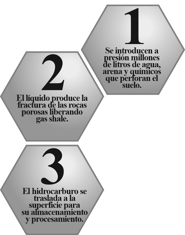 La extracción de los hidrocarburos no convencionales requiere utilizar de la fracturación hidráulica o Fracking. Esta técnica parte de la perforación de un pozo vertical hasta alcanzar la formación que contiene gas o petróleo; seguidamente se realiza una serie de perforaciones horizontales en la lutita, que puede extenderse por varios kilómetros en diversas direcciones; a través de estos pozos horizontales se fractura la roca con la inyección de una mezcla de agua, arena y sustancias químicas a elevada presión que fuerza el flujo y salida de los hidrocarburos (Figura 1).