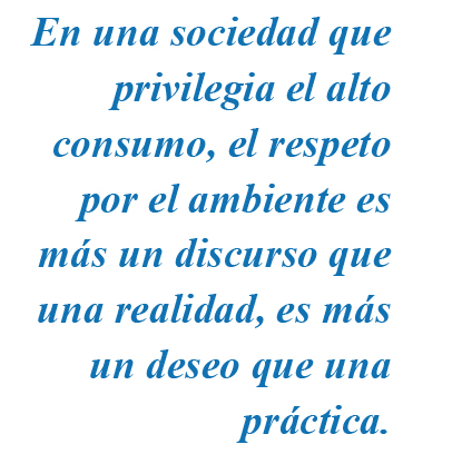 En una sociedad que privilegia el alto consumo, el respeto por el ambiente es más un discurso que una realidad, es más un deseo que una práctica. Damos por hecho que son otros los que atentan contra el entorno, y no nosotros, como una manera de tranquilizar nuestra conciencia, colocando un velo ante nuestros ojos que nos impide observar fidedignamente los hechos: todos somos partícipes en el deterioro de nuestro planeta.