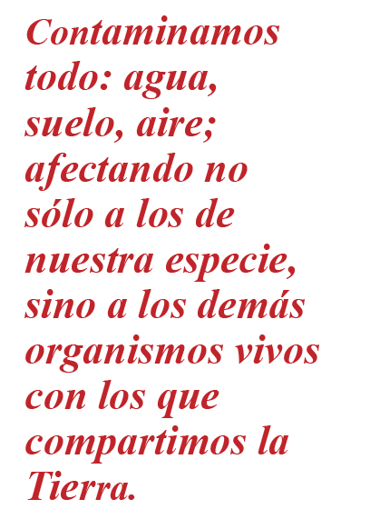 Contaminamos todo: agua, suelo, aire; afectando no sólo a los de nuestra especie, sino a los demás organismos vivos con los que compartimos la Tierra. El deterioro ambiental ha tenido grandes repercusiones como la pérdida de biodiversidad y la transformación de los ecosistemas, los cuales son disminuidos y dañados en función de que demandamos más agua, más energía, comida, etc.
