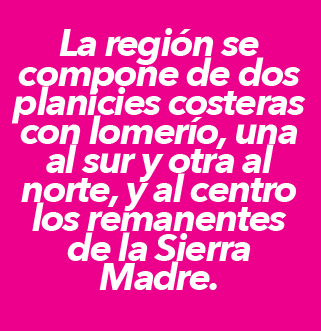 La región central del estado de Veracruz está delimitada al este por el Golfo de México y al oeste por la Sierra Madre Oriental. Esta barrera montañosa desciende hasta la región costera, en una pendiente que va de los 4282 m de altitud (cima del Cofre de Perote) hasta el nivel del mar, en una distancia horizontal de 100 km. La costa es una llanura interrumpida por elevaciones aisladas. De este modo, la región se compone de dos planicies costeras con lomerío, una al sur y otra al norte, y al centro los remanentes de la Sierra Madre.