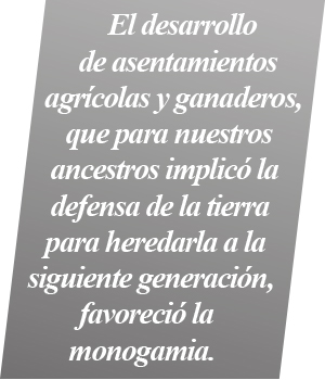 En lo que a nosotros se refiere, la monogamia tiene que ver con nuestra evolución como especie. Probablemente el desarrollo de asentamientos agrícolas y ganaderos, que para nuestros ancestros implicó la defensa de la tierra para heredarla a la siguiente generación, favoreció su difusión. Una interesante reflexión sobre el tema ha sido formulada por David Barash (uno de los autores del libro El mito de la monogamia. La fidelidad y la infedelidad en los animales y en las personas): “La monogamia entre los animales es una cuestión de biología. Incluso entre los seres humanos. Pero en el caso de los humanos, la monogamia es algo más. También es una cuestión de psicología, sociología, antropología, economía, derecho, ética, teología, literatura, historia, filosofía y de la mayoría del resto de las ciencias humanas y sociales”.