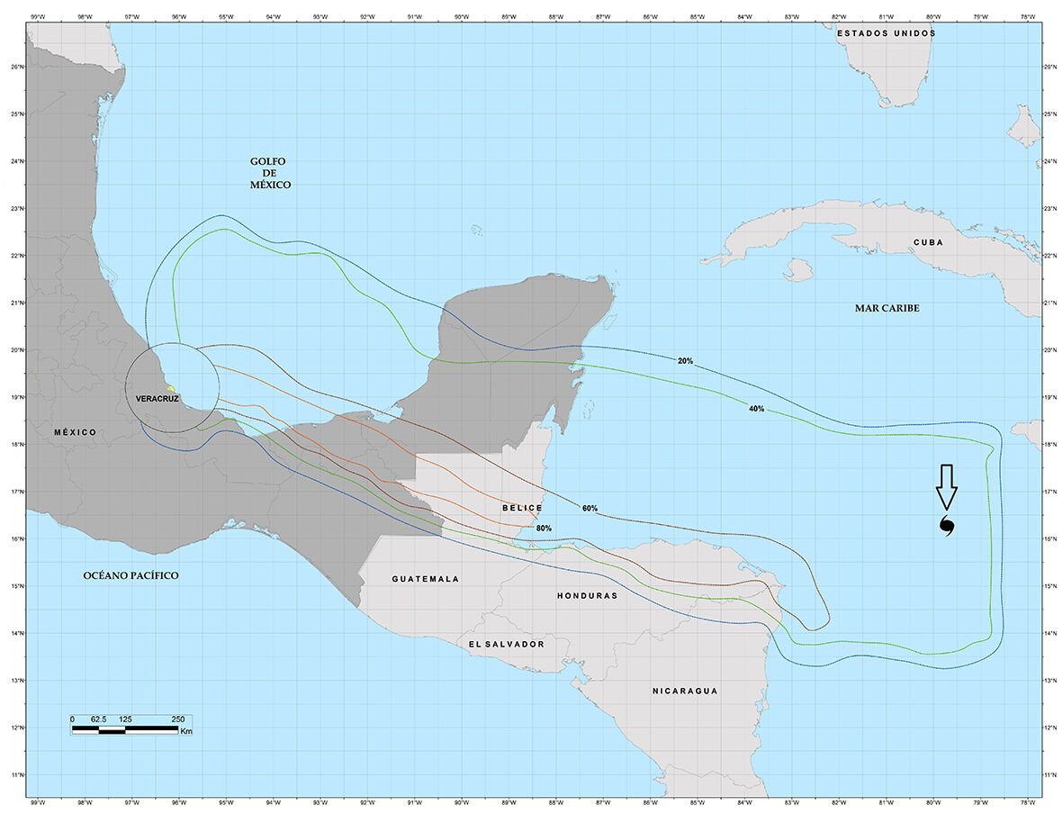 El uso de estos mapas se ejemplifica con el caso del puerto de Veracruz. La ubicación del símbolo de huracán (indicado con una flecha) significaría una probabilidad de entre el 40 y el 60 por ciento de que dicho sistema ingrese al círculo de 110 km de radio con centro en ese puerto.