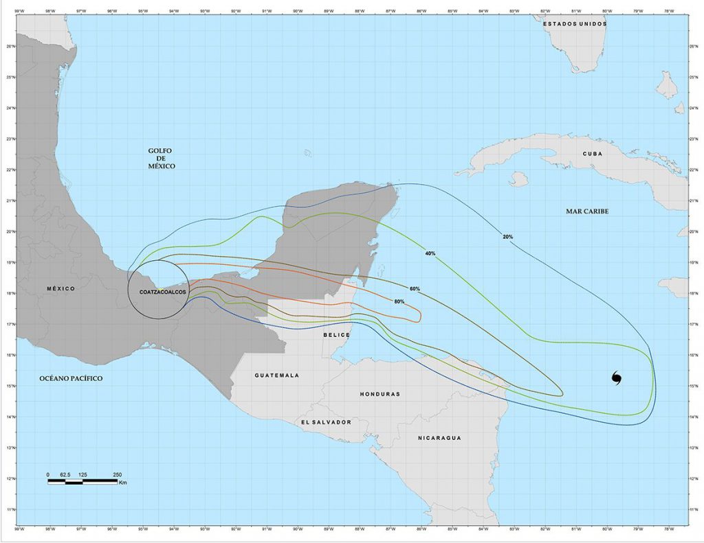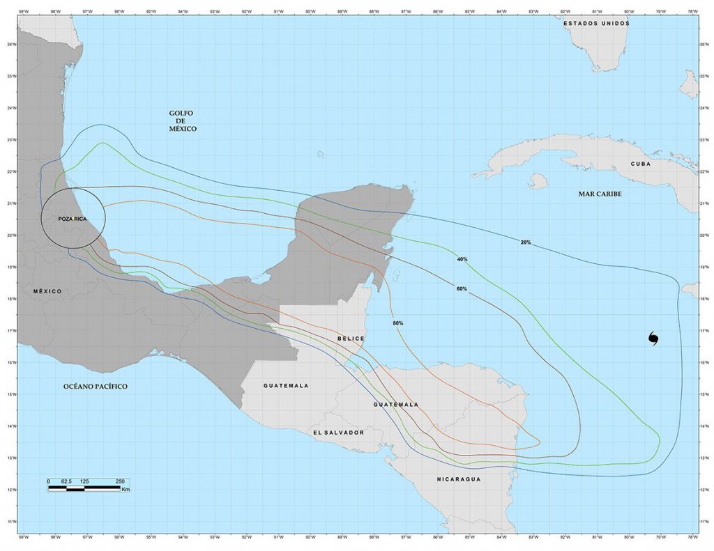 Los cuatro mapas incluidos en esta nota presentan la probabilidad que tendría la trayectoria de un huracán o una tormenta tropical de incursionar en las áreas de 110 km de radio centradas en los puertos de Coatzacoalcos, Veracruz o Tampico, o en la ciudad de Poza Rica. Sin embargo, debe quedar claro que estos mapas no constituyen pronósticos del desarrollo o evolución de los sistemas ciclónicos que potencialmente afectarían las costas de nuestro estado.