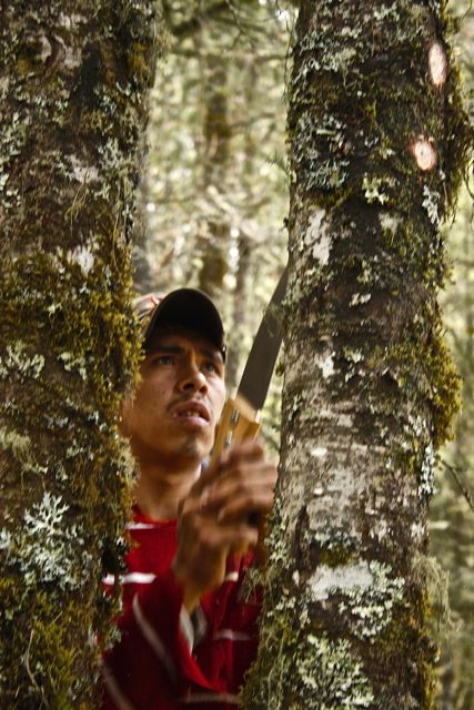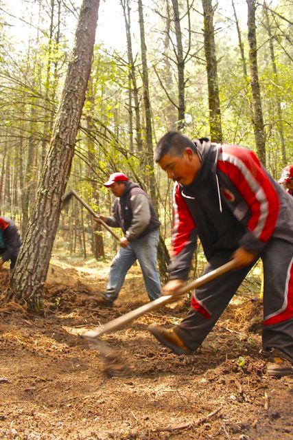 En 2013, un grupo de ejidatarios conformaron varias cuadrillas de trabajo. Empleo temporal, les ofreció el gobierno, «hay que darle mantenimiento al bosque». Con motosierras, machetes, azadones y una capacitación de organizaciones de silvicultores iniciaron los trabajos. En bosques densos -más de 3 mil árboles por hectárea- trabajaron durante unos meses haciendo brechas cortafuego, podas, tinas ciegas para que el agua en lugar de escurrirse se infiltre a «las venas de la montaña».