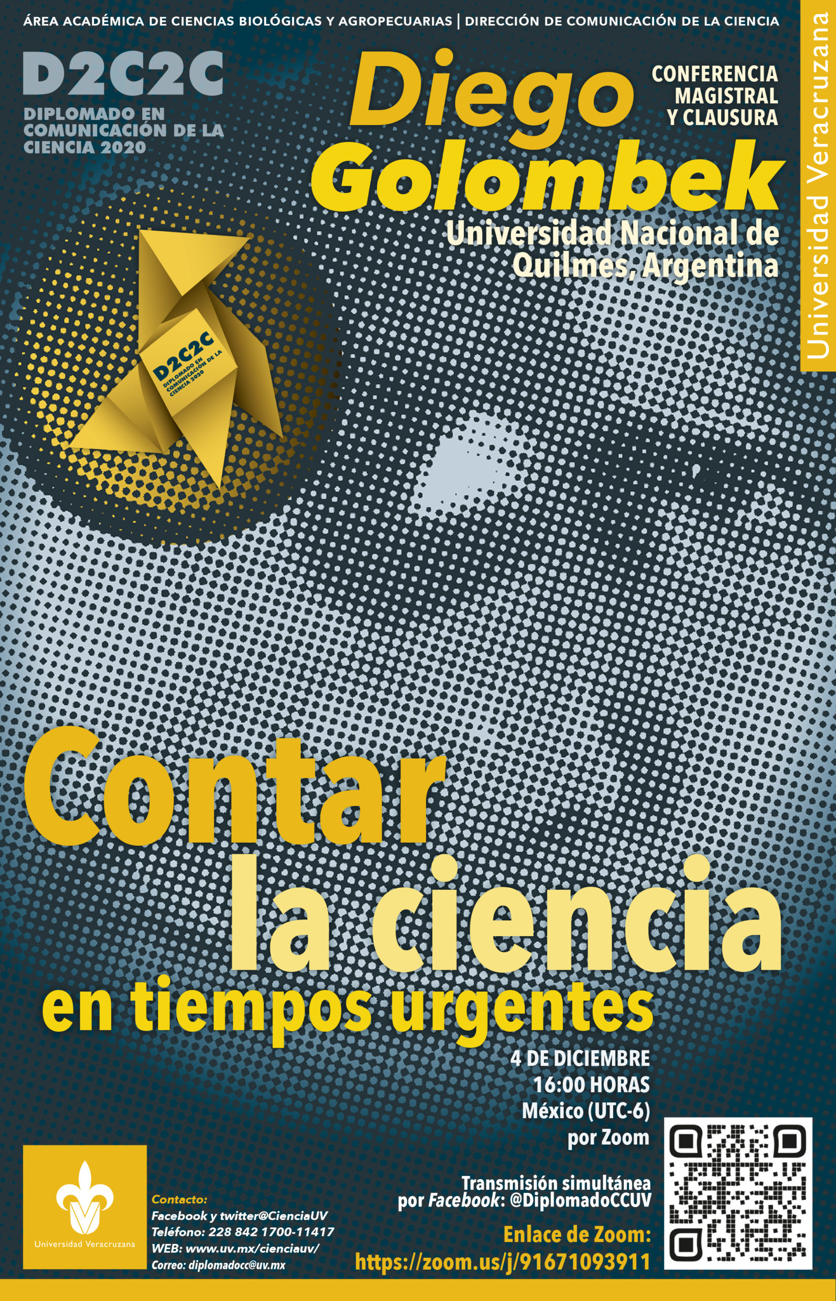 2 de diciembre 2020, Xalapa Ver. Con la participación de Diego Golombek, cronobiólogo de profesión y uno de los principales referentes de la divulgación científica en América Latina, el Diplomado en Comunicación de la Ciencia de la Universidad Veracruzana (UV) cerrará su ciclo 2020 de formación profesional, en un evento de clausura que se transmitirá por zoom y facebook este viernes 4 de diciembre, a las 16:00 horas.