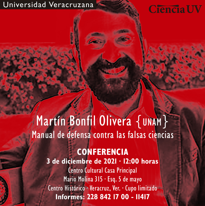 Conferencia Magistral “Manual de defensa contra las falsas ciencias” impartida por el Mtro. Martín Bonfil Olivera el día viernes 3 de diciembre del presente año, a las 12:00 horas, a efectuarse en el Centro Cultural Casa Principal, ubicado en la calle Mario Molina 315 esq. 5 de Mayo, en el Centro Histórico de la ciudad de Veracruz, Ver.