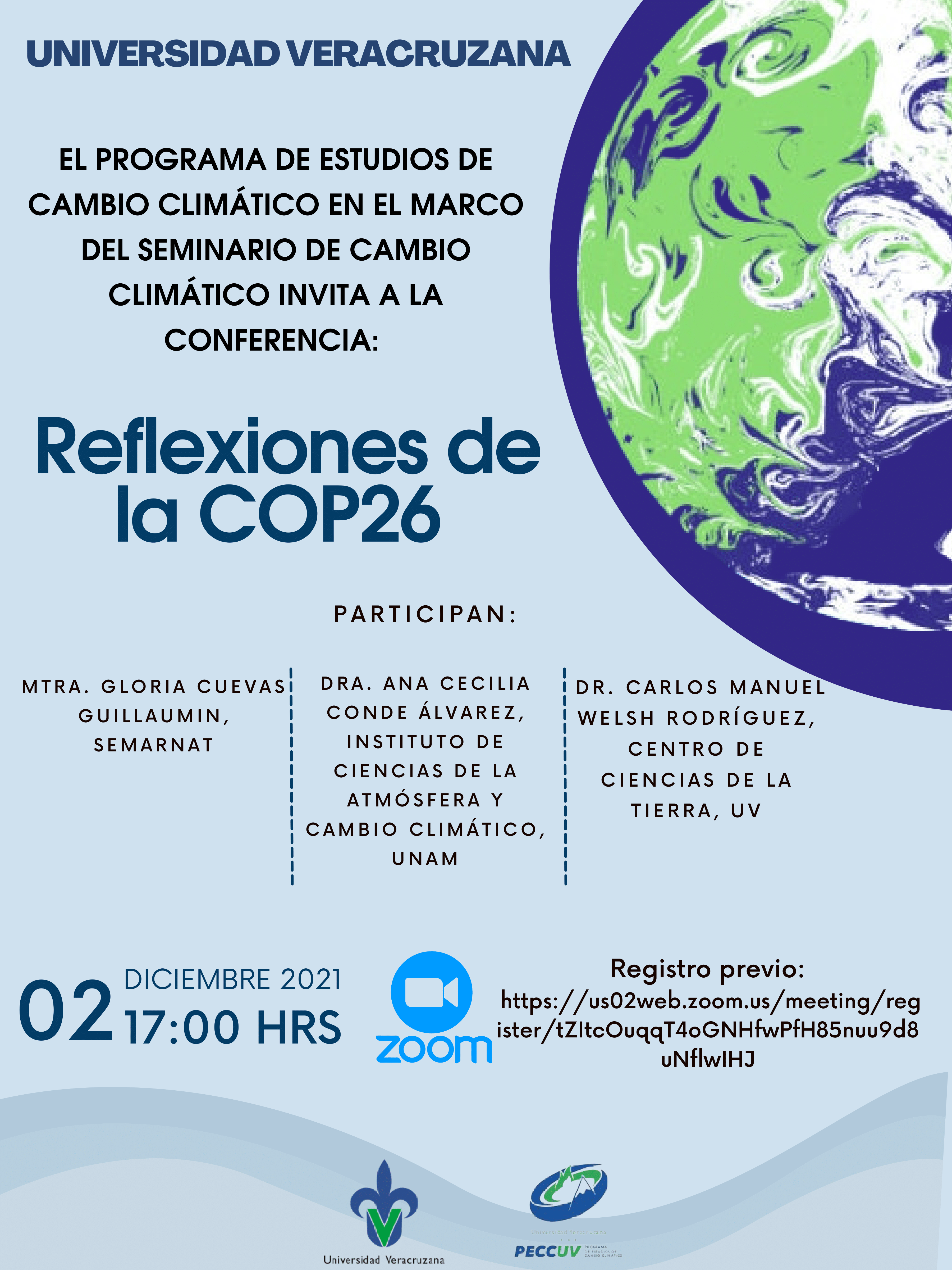 El Programa de Estudios de Cambio Climático UV en el marco del Seminario de Cambio Climático invita a participar en la Conferencia Reflexiones de la COP26 el cual se llevará a cabo el día 2 de diciembre a las 17:00 horas en la plataforma Zoom, en el siguiente enlace: