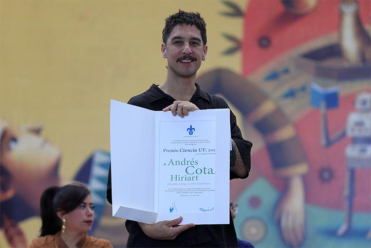 31/05/2025, Xalapa, Ver.- Reconociendo su destacada labor en la divulgación científica, la Universidad Veracruzana (UV) entregó el Premio Ciencia UV colectivo al Grupo Cultural Científico Lumo, e individual al naturalista y escritor Andrés Cota Hiriart, en el marco de la Feria Internacional del Libro Universitario (FILU) 2025.
