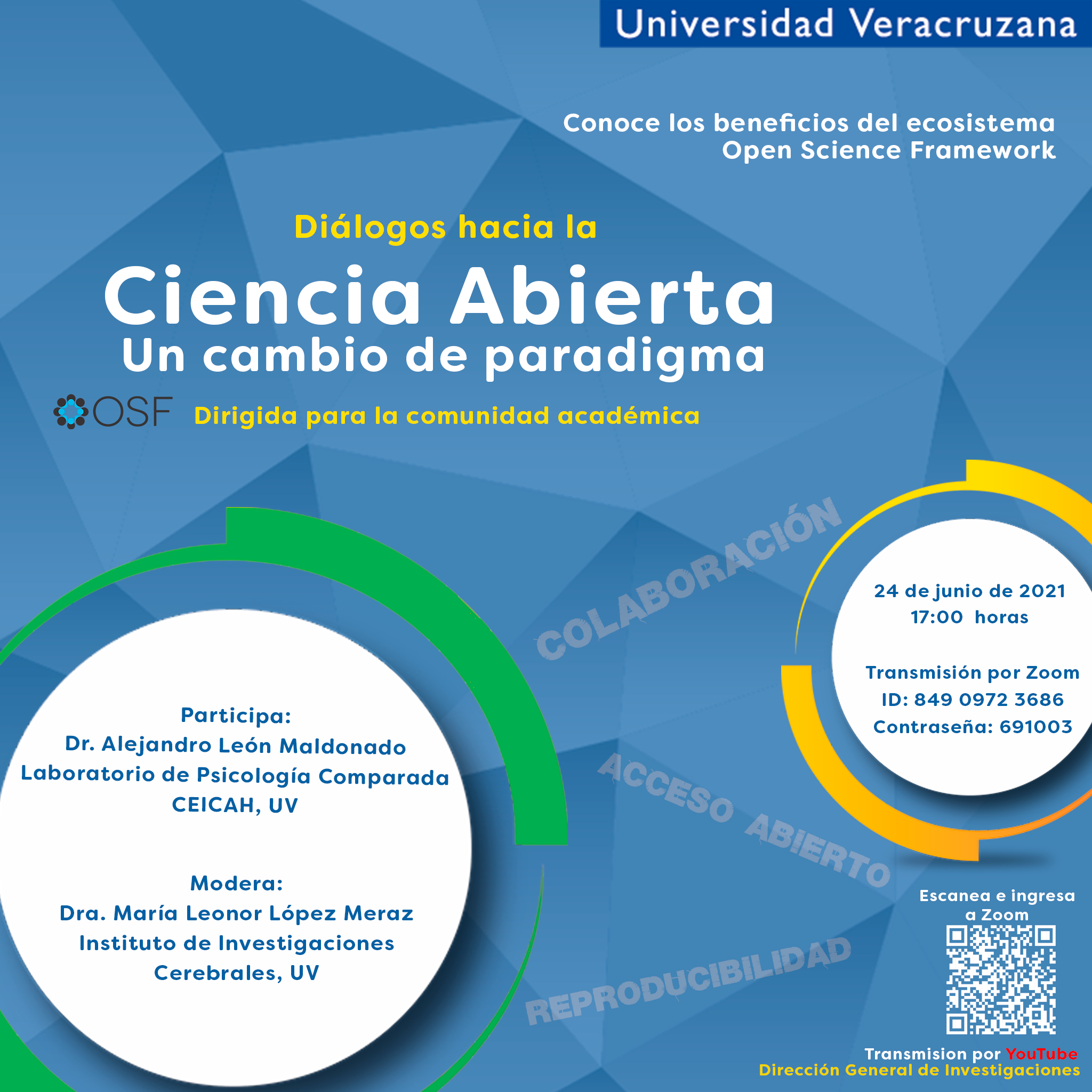 Conoce los beneficios del ecosistema Open Science Framework. Ciencia Abierta: Un cambio de paradigma. Participa el Dr. Alejandro León Maldonado del Laboratorio de Psicología Comparada del CEICAH y la Dra María Leonor López Meraz del Instituto de Investigaciones Cerebrales de la UV.