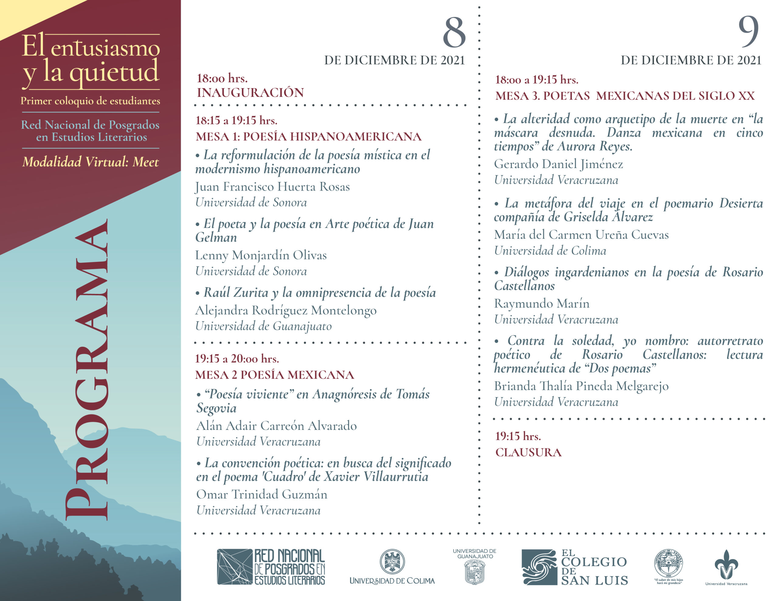 La Red Nacional de Posgrados en Estudios Literarios que preside el Instituto de Investigaciones Lingüístico- Literarias lo invitan a participar en el Primer Coloquio de Estudiantes: “El entusiasmo y la quietud”.