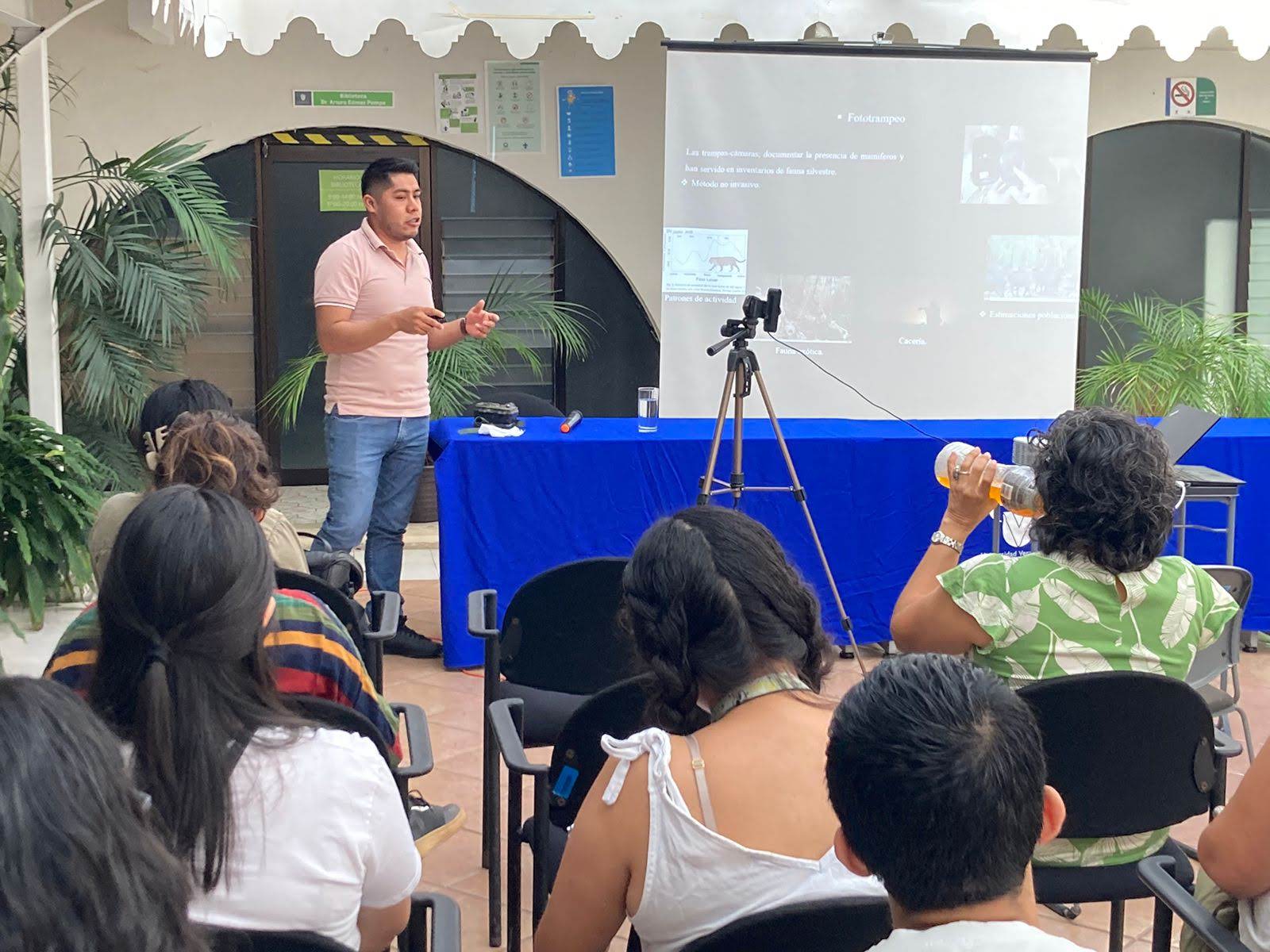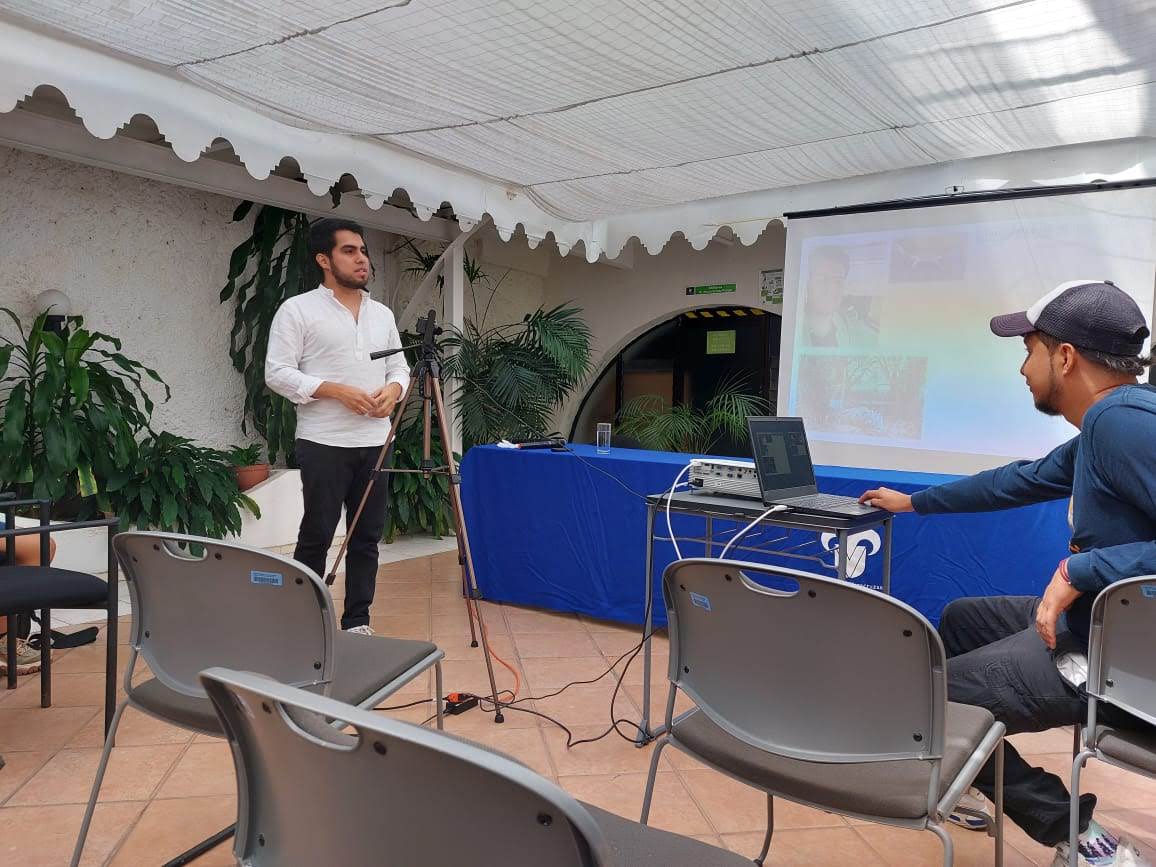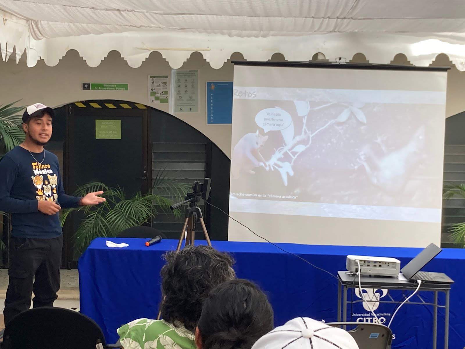 El primer bloque estuvo constituido por las presentaciones orales enfatizando las experiencias en campo: los retos, facilidades, dificultades y aprendizajes que los estudiantes han generado en las zonas de estudio. Participaron los alumnos de Maestría Luis Ángel Rosales Lara (Zongolica Herbarium: el cerro del Acontécatl), Mauricio Javier Mezhua Velázquez (Retos en el fototrampeo de mamíferos), Luis David Pérez Gracida (¿Un perro de agua?), Eire Ramírez García (Tesoros escondidos en los bosques de niebla de México) y Jaime Francisco Camelo Vidal (Los manglares: entre el calor y los mosquitos), así Sandra Milena Ospina Garcés (Conociendo a los murciélagos pescadores), posdoctorante en el CITRO.