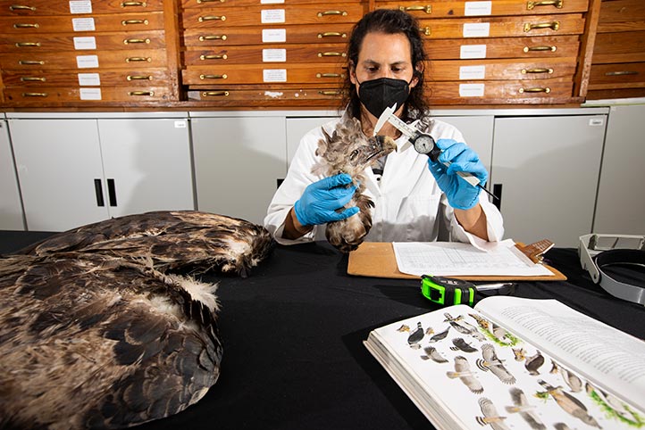 El investigador mide y toma muestras de la última águila harpía colectada en Nanchital, Veracruz, en los años ochenta