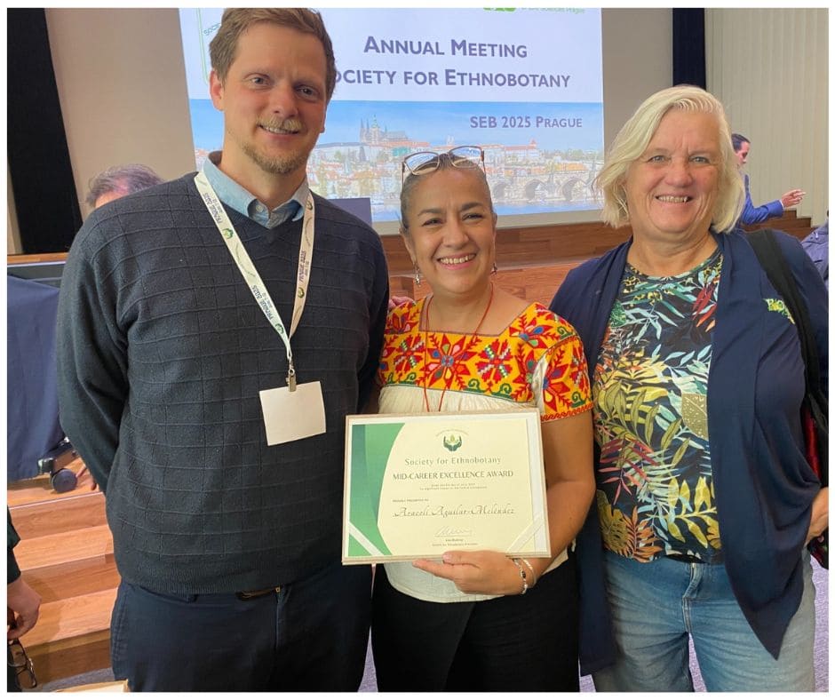 Araceli Aguilar recibió este reconocimiento durante la Reunión Anual de la Society for Ethnobotany (SEB 2025) llevada a cabo del 7 al 12 de junio de 2025 en Praga, República Checa. Obtuvo este reconocimiento por las contribuciones significativas que ha realizado a la etnobotánica desde las primeras etapas de su carrera, combinando con excelencia la investigación científica, la enseñanza, el trabajo con comunidades locales y la divulgación pública.