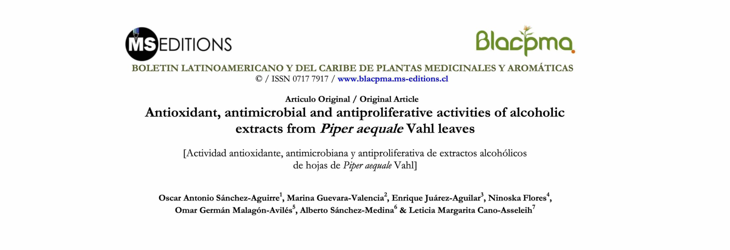 30/10/2024, Xalapa, Ver., Leticia M. Cano Asseleih, académica del Centro de Investigaciones Tropicales (CITRO-UV), Alberto Sánchez Medina, académico del Instituto de Química Aplicada (UV) y el Dr. Oscar Antonio Sánchez Aguirre egresado del doctorado en Ciencias Biomédicas de la UV, a quien codirigieron su tesis doctoral los dos investigadores mencionados, publicaron el artículo “Antioxidant, antimicrobial and antiproliferative activities of alcoholic extracts from Piper aequale Vahl” en el Boletín Latinoamericano y del Caribe de Plantas Medicinales y Aromáticas (BLACPMA). Este producto obtenido de la investigación doctoral fue realizado en el marco de una colaboración internacional, con investigadores de la UV, Enrique Juárez Aguilar del Instituto de Ciencias de la Salud, Marina Guevara Valencia de la Facultad de Ciencias Químicas campus Orizaba, e investigadores internacionales Dra. Ninoska Flores de la Universidad Mayor de San Andrés (Bolivia) y Dr. Omar Germán Malagón Avilés de la Universidad Técnica Particular de Loja (Ecuador).
