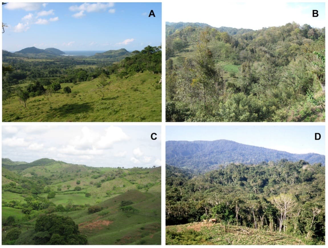 - Vistas de paisajes modificados por el hombre en el Neotrópico, incluidos fragmentos de bosques maduros, bosques secundarios, pastizales con árboles remanentes y tierras agrícolas.